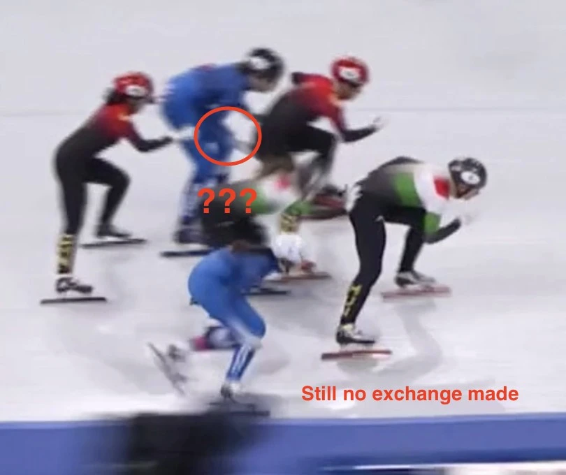 ISU (International Skating Union)의 혼성계주에 대한 경기 규정에 따르면 (참조. 2021 Special Regulations and Technical Rules Short Track Speed Skating 51페이지 참조) 다른 팀 스케이터로 인해 터치 (exchanges)가 이루어지지 않은 경우 푸시 (엉덩이를 밀어주는 동작)를 하지 못한 선수는 반 바퀴를 추가로 스케이팅하여 다음 주자와의 터치가 이루어져야 한다고 분명히 명시되어 있다. 하지만 터치가 이뤄지지 않아도 괜찮다는 규정은 존재하지 않는다.