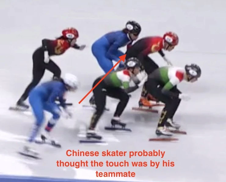 이와 같은 추월 상황은 국내 경기에서는 경기중 너무나도 자주 일어나는 일이고, 심지어 국제경기에서도 자주 일어난다. 이와 같은 추월 상황에서 경합하고 있는 선수가 설령 넘어졌다고 하더라도, 선수간에 몸이 부딪히지 않았다면 대부분 실격을 주지 않는다. 하지만 황선수가 페널티를 받은 이유는 뒤늦게 추월을 시도해서 부딪힘을 유발했다는 것이다. 영상을 보면 황선수와 중국 선수의 부딪침은 고사하고 중국 선수들끼리의 부딪힘도 없었다. 다만 2위로 달리던 리웬롱선수가 갑자기 추월한 황선수를 보고 놀라서 넘어질 뻔했던 것뿐이다. 글자 그대로 causing contact (부딪힘 유발) 관점에서 봤을 때, 황대헌선수의 추월이 어떤 추가적인 부딪힘의 원인이 되었다면 황대헌 선수에게 실격을 주어도 납득할 수 있지만, 추월 후 연쇄적으로 부딪힘이 유발되지 않았기 때문에 실격이라 볼 수는 없다. 아니 놀라서 당황한 것까지 봐줘야 하나.