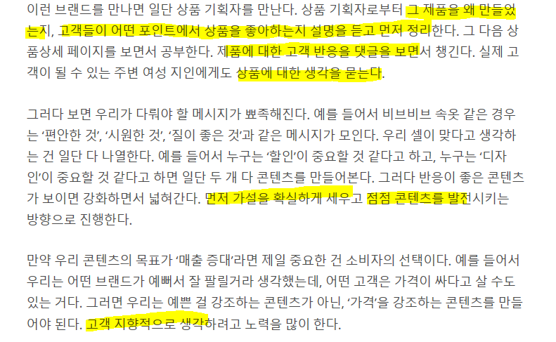 위의 기사를 통해 공감한 부분은 위와 같다. 왜 제품을 만들었는지? 고객들이 어떤 포인트에서 상품을 좋아하는지 설명을 듣고 먼저 정리해보는 것