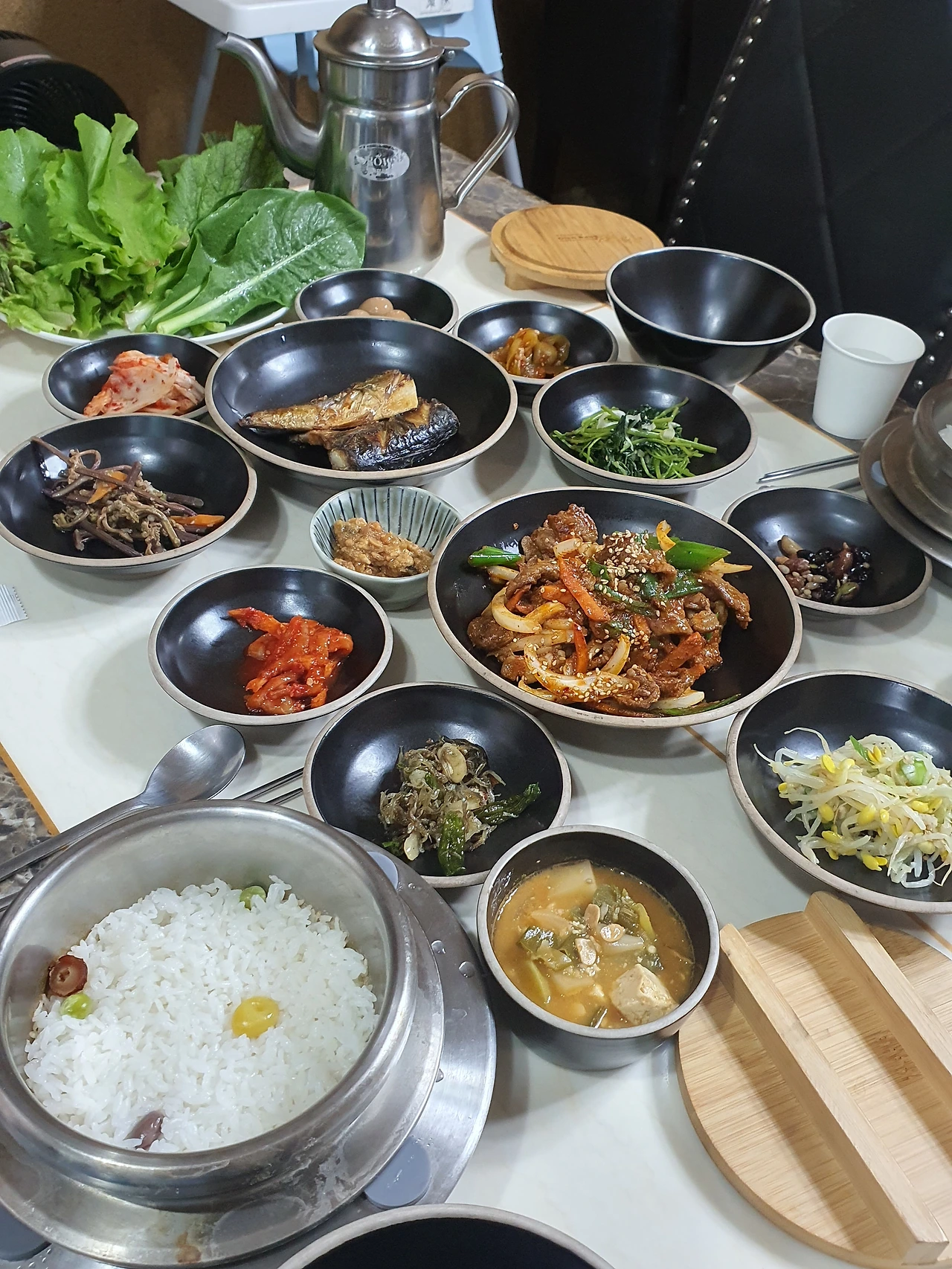 싱싱한 쌈채소를 두 겹씩 쌓고 고기를 한가득 입안에 넣었다. 특히 뭉근하게 끓인 된장국이 참 진하고 맛있었다. 돌솥에 누룽지까지 야무지게 긁어먹은 뒤, 배부른 배를 통통 치며 모녀는 사장님께 외쳤다.