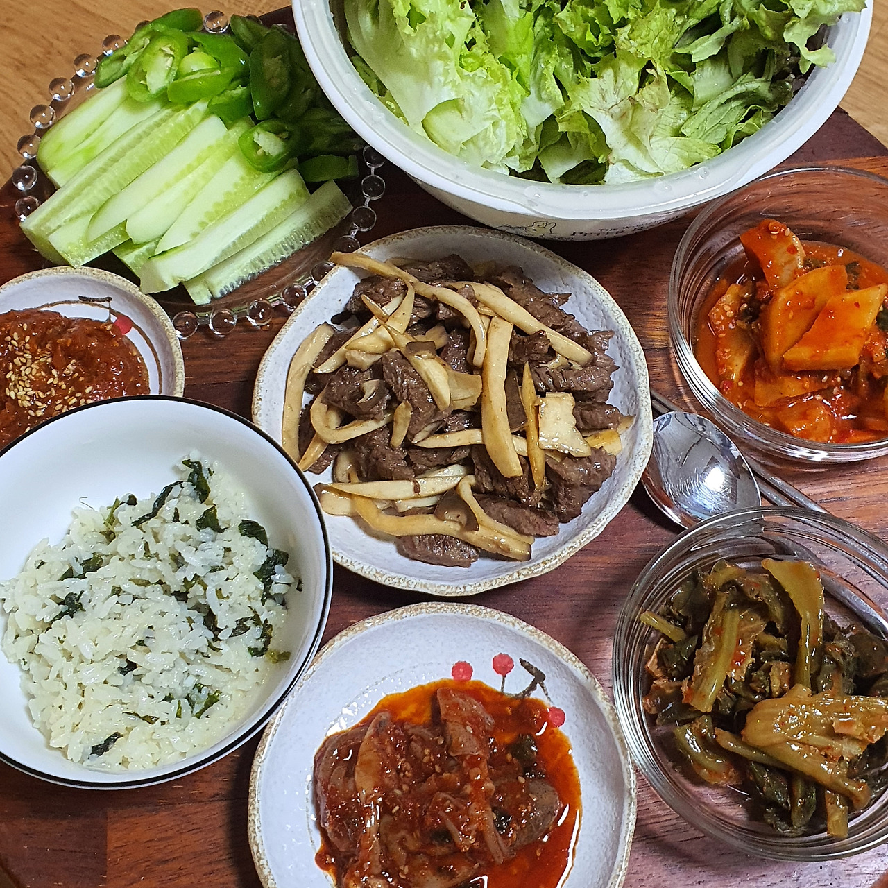 가벼운 피로감을 기분좋게 느끼며 집에 돌아와 저녁식사를 하였다. 역시 순천에 오면 화려한 진수성찬보다는 소담스러운 시골 밥상이 가장 맛스럽다. 곤드레밥과 꼴뚜기젓갈 그리고 직접 담근 김치들이 주인공이 되는 밥상에서 소고기는 조연이다.