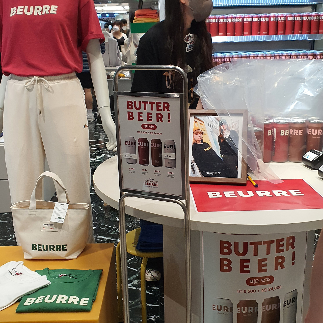 이곳은 일반적인 의류 매장들 사이에 섞여 있었는데, 흥미롭게도 실제로 고객들이 줄을 서서 구매하고 있었던 제품은 의류가 아닌 맥주였다. 신세계 정용진 부회장이 웨이팅을 서서 구매해 갔다던 블랑제리 뵈르의 '버터 맥주'는 A부터 D까지 총 4가지 버전의 풍미로 나눠져 있다. 4종 중 2종은 솔드아웃되어 남은 2종을 한 캔씩 구매해왔다.