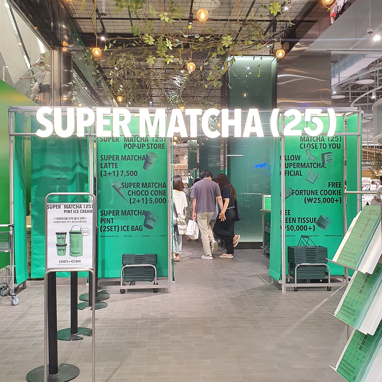 가장 처음 들른 곳은 GS25와 콜라보레이션을 진행한 브랜드 <슈퍼말차25>. 말차 소재를 활용한 제품과 굿즈를 진열해놓은 팝업스토어였다. 말차 색의 그린을 시그니처 컬러로 선정하고 모든 공간뿐 아니라 출시되는 브랜드 제품들까지 온통 그린 그린 그린! 을 주창하고 있었다.슈퍼말차? 하면 그린 컬러! 가 곧바로 떠오를 수 있게 컨셉 포인트를 야무지게 잡은 브랜드라고 생각했다.