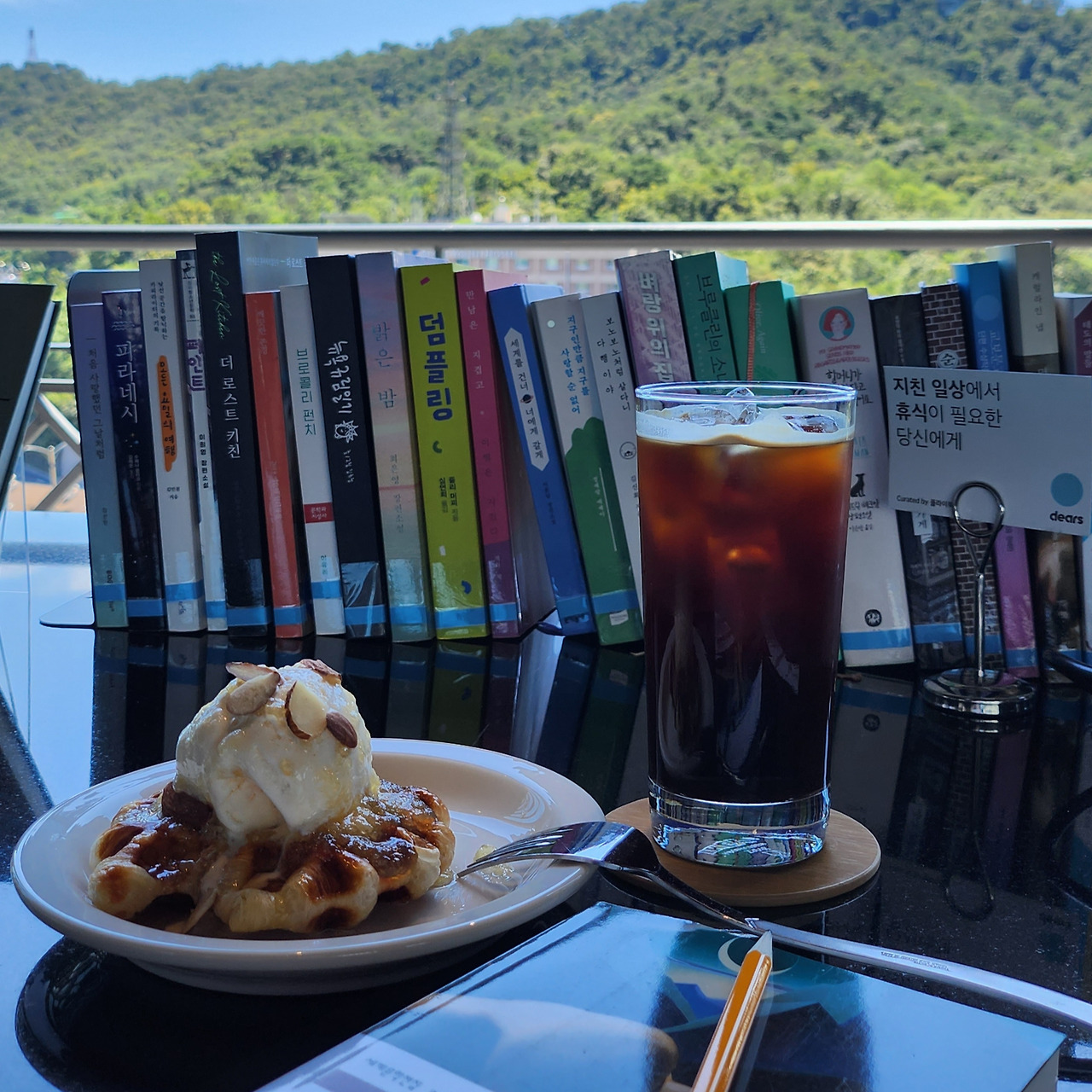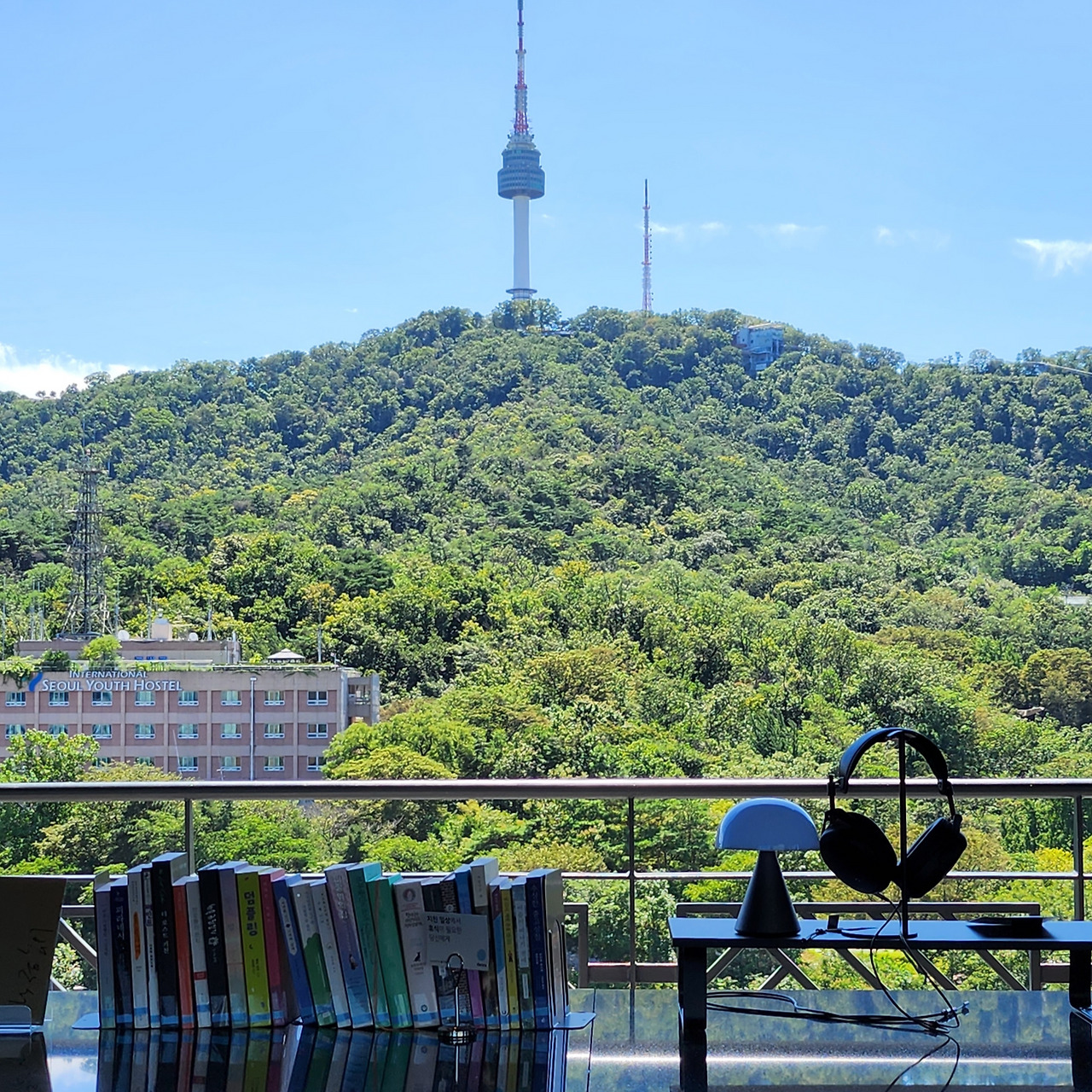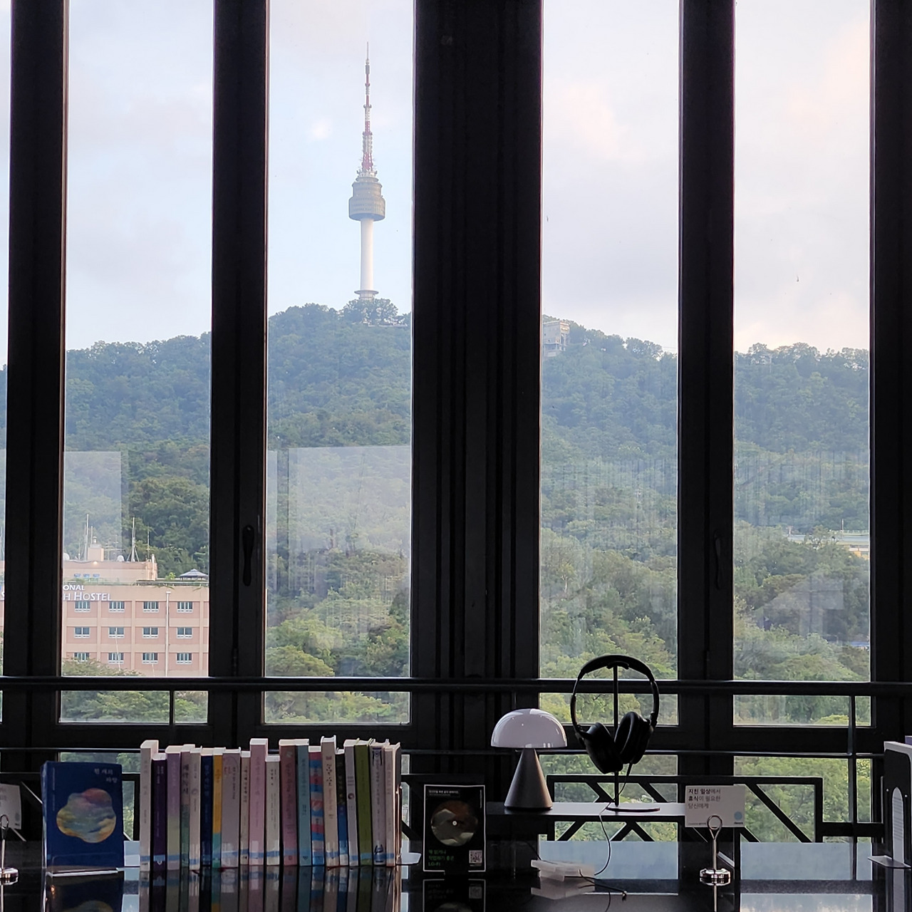 이곳의 분위기와 전경을 한 번 즐기는 것만으론 부족해 바로 이튿날 대낮에 연달아 방문하였다. 눈부시게 또렷했던 가을 하늘의 남산이 당장에 코앞에 닿을 것만 같던 순간이었다. 책과 그 앞으로 쏟아지는 황홀한 풍경을 오롯이 받아내는 공간.