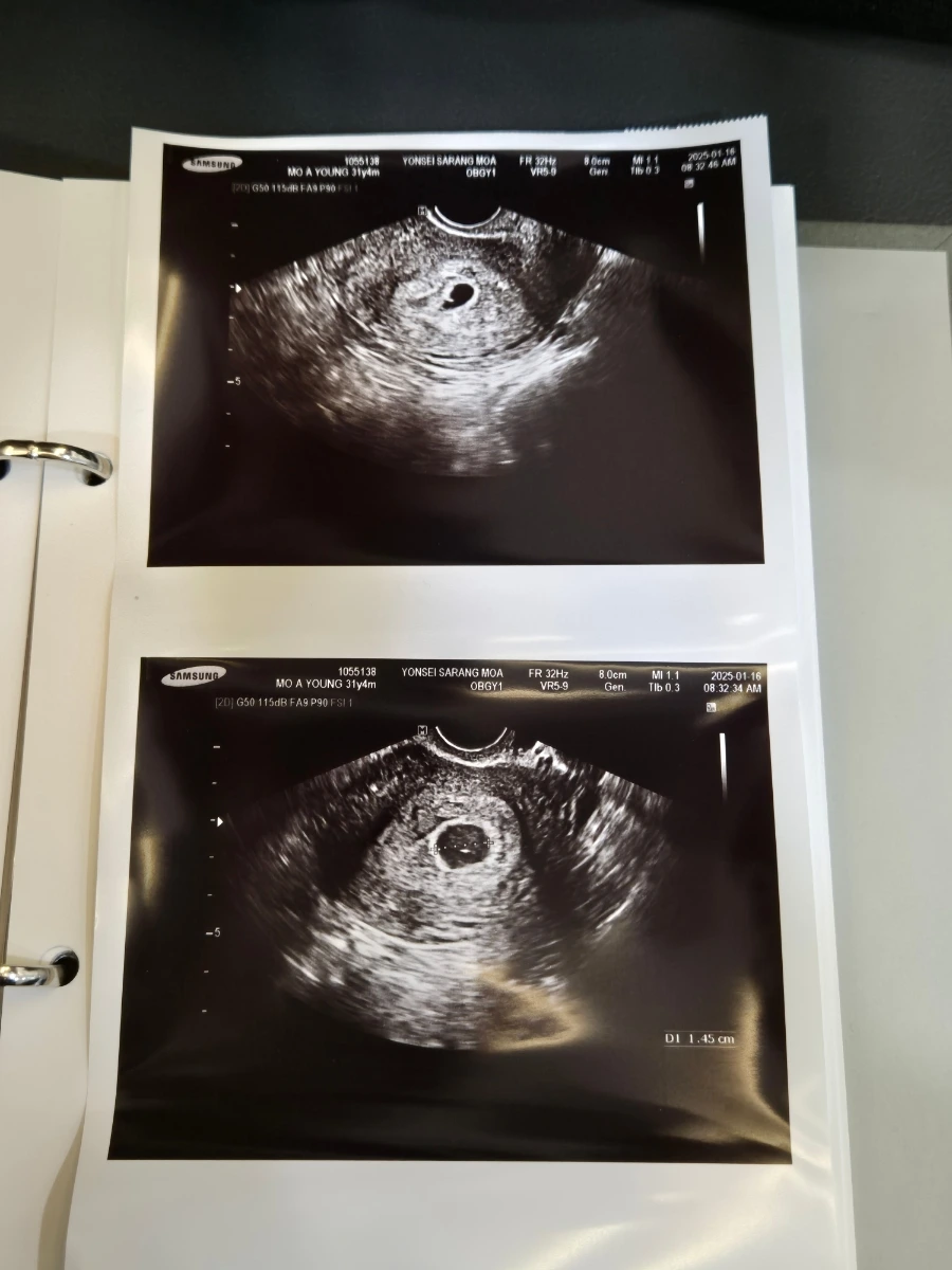 처음 산부인과를 찾던 날은 어찌나 걱정되고 떨렸는지 모르겠다. 임신이 아니었으려나, 아기집이 잘 안 보이면 어쩌지.. 온갖 잡생각을 안고 갔는데 다행히 좋은 위치에 잘 자리 잡고 있다는 소식을 듣고 안심했던 기억이 있다. 남편과 태명을 고민하기 시작했던 시기다.