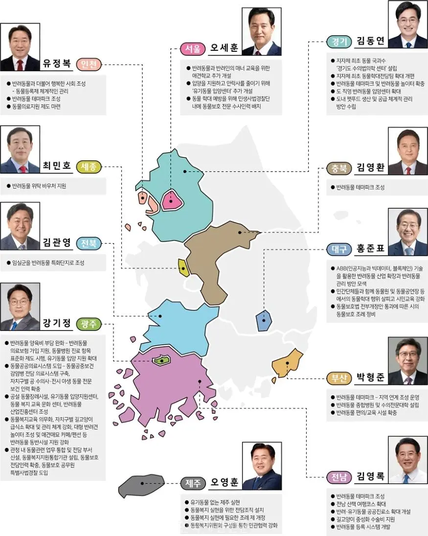 먼저, 반려동물에 관한 정책이다. 이는 대부분의 당선인이 가장 중심적으로 다룬 정책이다. 서울 시장 오세훈은 반려동물과 반려인의 매너 교육을 위한 애견학교 추가 개설을 말했다. 인천 시장 유정복과 경기도지사 김동연, 충북지사 김영환, 전남지사 김영록, 부산 시장 박형준은 공통적으로 반려동물과 더불어 행복한 사회 조성을 위해 반려동물 테마파크 및 놀이터를 확충하자고 했다. 광주 시장 강기정은 반려동물 동반시설 지원을 강화하자고도 했다. 세종 시장 최민호도 반려동물 위탁 바우처 지원을 강화하고자 한다. 전남지사 김영록과 인천 시장 유정복은 동물 등록제의 체계적 관리를 강조하기도 했다. 광주 시장 강기정은 반려동물 양육비 부담 완화와 함께 많은 당선인들이 반려동물 종합병원 및 수의전문대학 설립을 말했다. 이외에도 반려동물에 관한 정책은 다양하다.