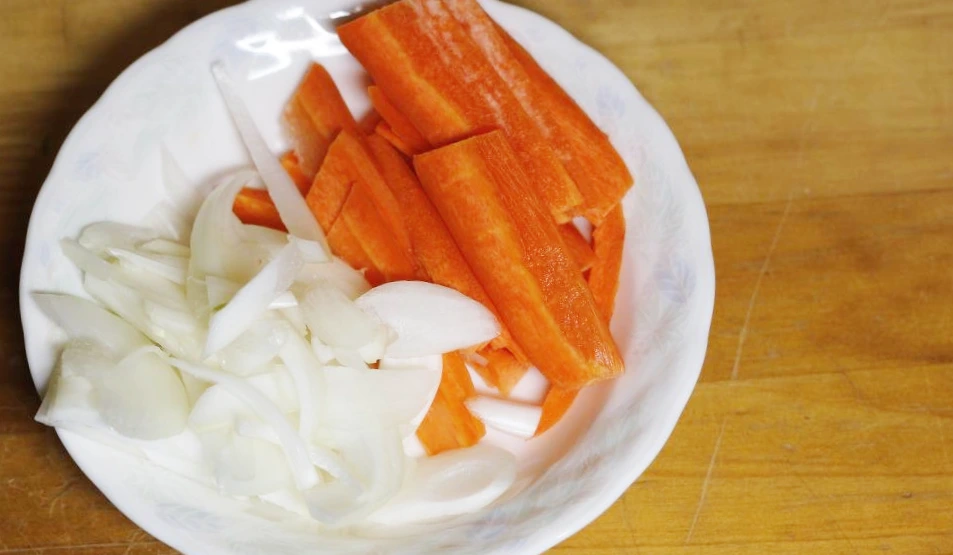 야채를 다 잘랐다면 냄비에 기름을 두르고 야채를 볶기 시작한다. 야채를 넣는 순서는 양파 > 당근 > 버섯을 추천하지만 굳이 지킬 필요는 없다. 양파를 볶을 때 다진 마늘을 함께 넣어도 되지만 시중에서 파는 소스를 사용한다면 이미 소스에 충분한 양의 마늘이 들어있으므로 굳이 넣을 필요는 없다. 버섯의 경우 오래 볶을수록 수분이 날아가 고기와 비슷한 식감을 가지게 되는데 시간이 없거나 귀찮거나 고기와 비슷한 식감의 버섯을 먹기 싫다면 조금만 볶아도 된다.