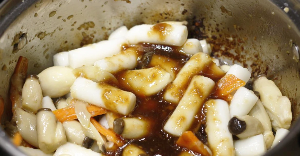 야채가 어느 정도 익었다면 떡을 투입하고 소스를 붓는다. 소스의 양은 너무 많이 넣지 말고 적당히 넣길 바란다. 색깔이 연하다고 소스를 너무 많이 투입하면 엄청나게 짠 간장 떡볶이를 먹게 된다.