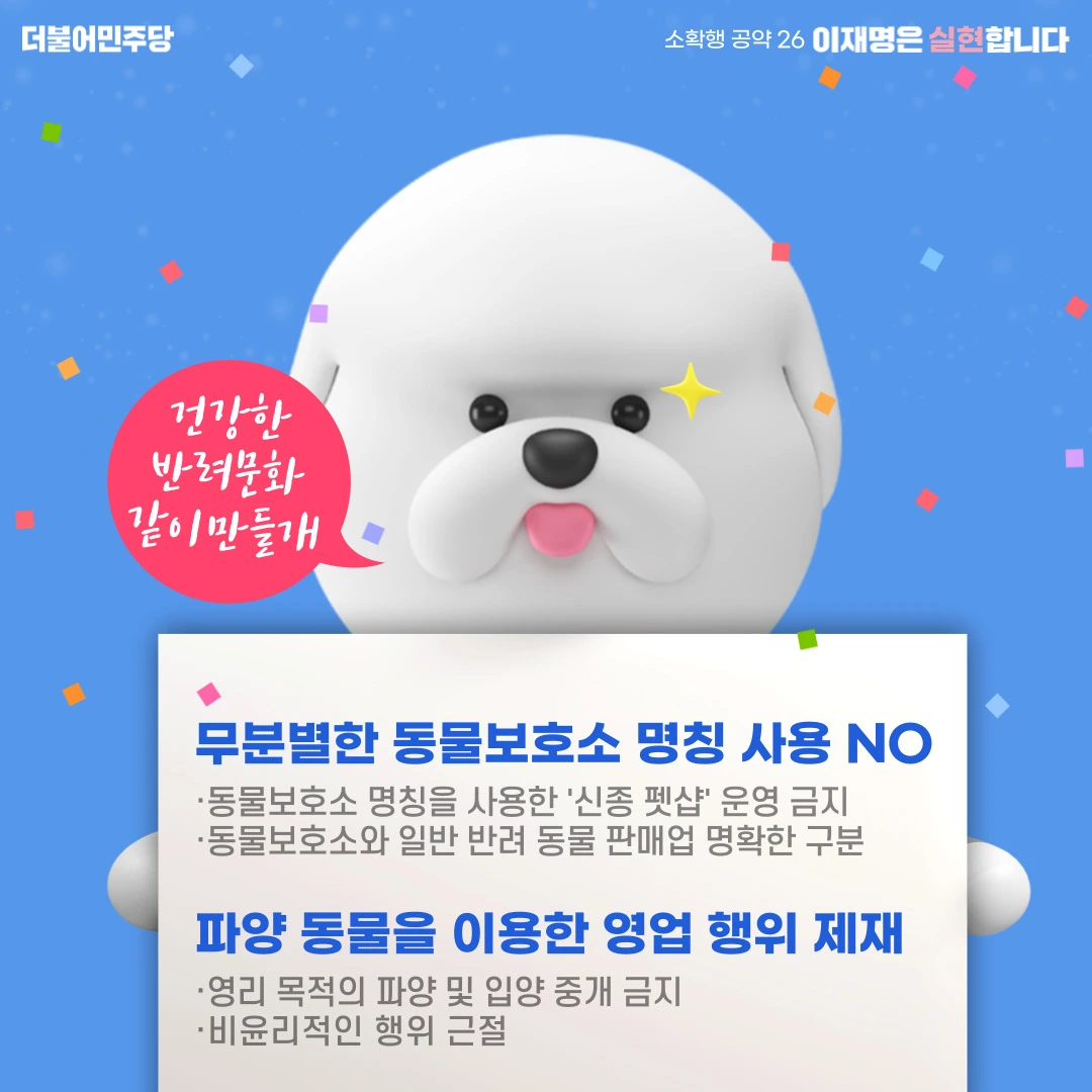 두번째로 강조한 공약은 ‘동물보호소의 가면을 쓴 신종 펫샵(Pet shop) 근절’(소확행 공약26)이다. ‘동물보호소’라는 명칭을 무분별하게 사용해 사실상 반려동물을 사고 파는 신종 펫샵이 사회적 문제가 되고 있다는 것이다. 이로서 반려동물의 파양을 조장하고, 동물의 복지뿐만 아니라 건전한 입양과 반려 문화 정칙을 방해하는 ‘신종 펫샵’을 근절하겠다고 한다.