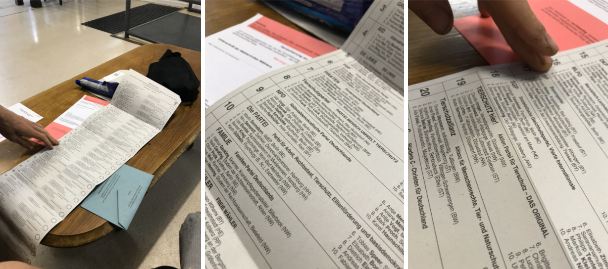 우리나라에는 정당 이름에 ‘동물’이 들어간 정당이 단 하나도 없는데, 독일에는 3개나 있다는 사실에 사진을 찍어두었다. 기억에 따르면 정당 번호가 낮을수록 의석을 많이 차지했거나, 지난 투표에서 투표율이 높았던 정당이다. 동물복지 당이 지난 투표에서 8번째로 투표를 많이 받았던 정당이라는 사실이 참 놀라웠다.