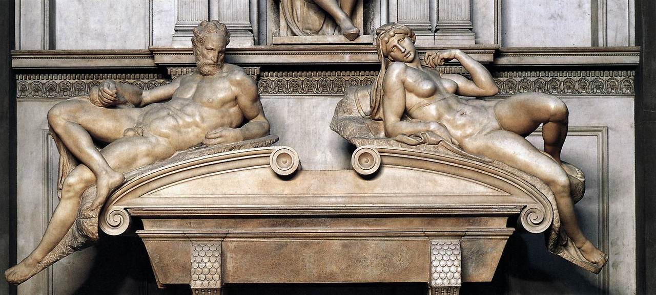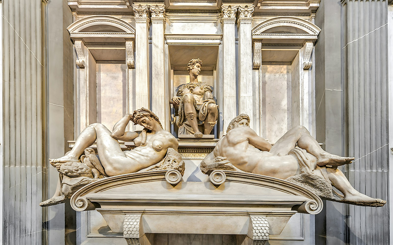 그 변화는 조각에서 가장 먼저 나타난다. 피렌체의 산 로렌초 성당에서 수행한 메디치 가문의 무덤 조성 작업에서, 그는 〈밤과 낮(Night and Day)〉, 〈새벽과 황혼(Dawn and Dusk)〉같은 형이상학적 상징이 깃든 인물상을 선보인다. 각각은 삶의 시간, 인간 존재의 순환을 나타내며, 전통적인 영웅상과는 전혀 다른 조용한 힘을 발산한다.