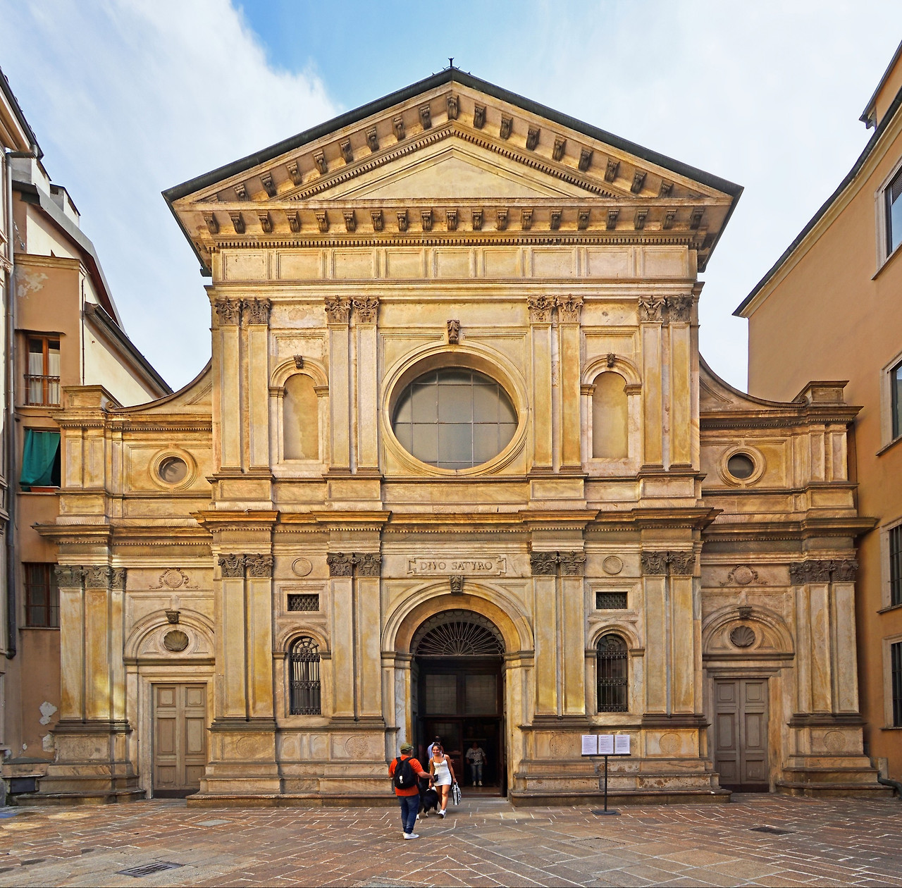그가 설계한 초기 건축물 중 하나로는 밀라노의 산타 마리아 프레소 산 사티로 교회(Santa Maria presso San Satiro, 1478~86)가 있다. 이 건물은 좁은 대지 조건에도 불구하고, 가짜 원근 투시 기법을 사용해 깊은 후진(後陣)을 만들어낸 착시 건축으로 유명하다. 그는 이 건축에서 그림에서 사용하는 선 원근법을 건축에 적용하며, 시각적 감각이 뛰어난 설계자로 주목받게 된다.