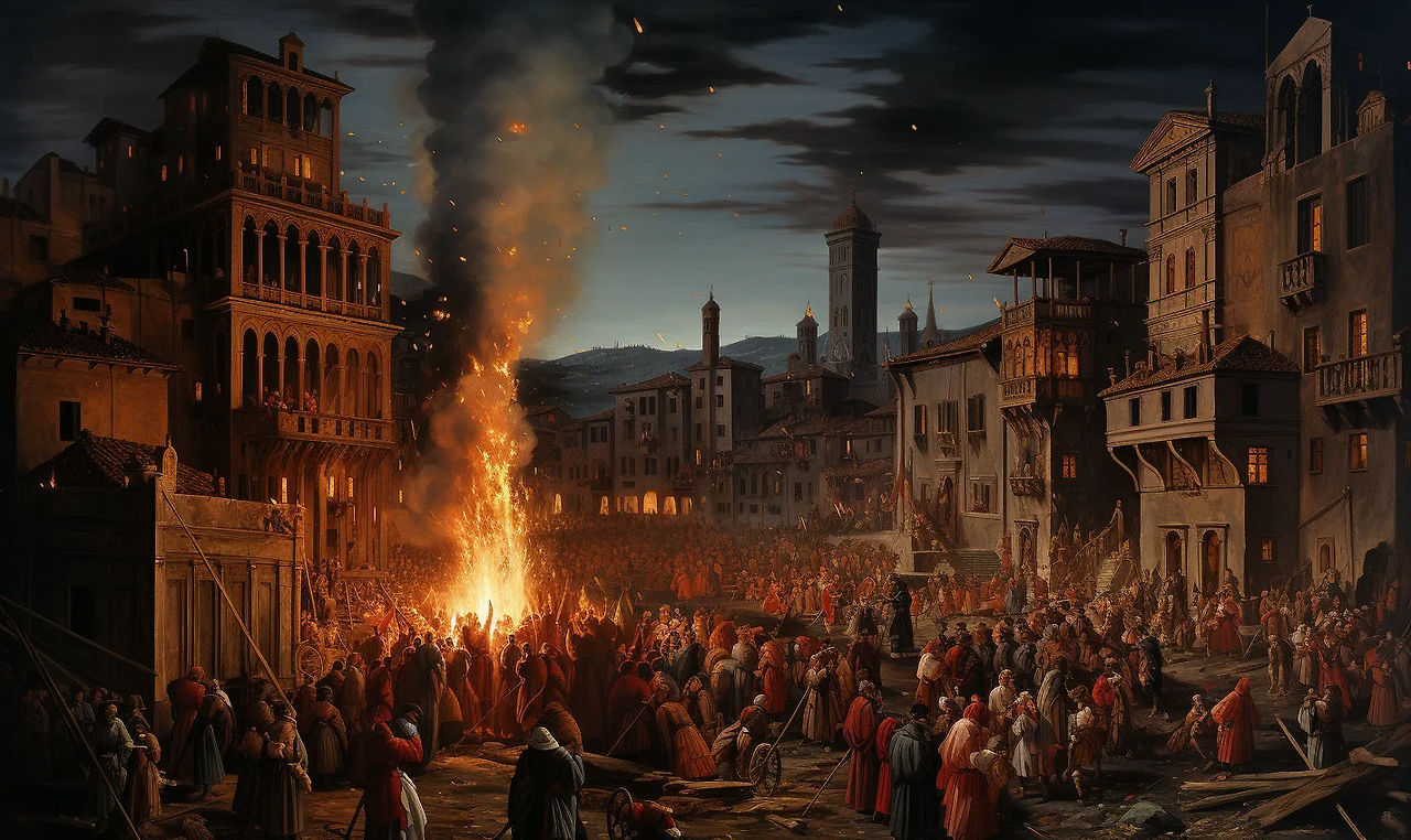그리고 1497년 2월 7일, 역사에 길이 남을 사건이 피렌체 시뇨리아 광장에서 벌어졌습니다. 바로 '허영의 화형 (Bonfire of the vanities)'입니다.
