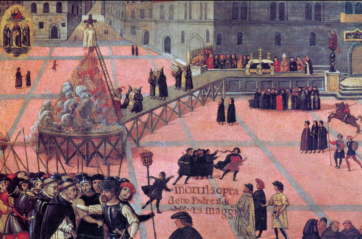 불과 1년 뒤인 1498년 5월 23일, 산타 마리아 델 피오레 대성당 앞 광장은 다시 한 번 군중으로 가득 찼습니다. 하지만 이번엔 예언자의 설교를 듣기 위한 청중이 아니라, 처형을 지켜보기 위한 구경꾼이었습니다. 무대 위에는 사보나롤라와 그의 측근 두 명이 교수형을 당한 뒤, 시신이 불태워졌습니다.