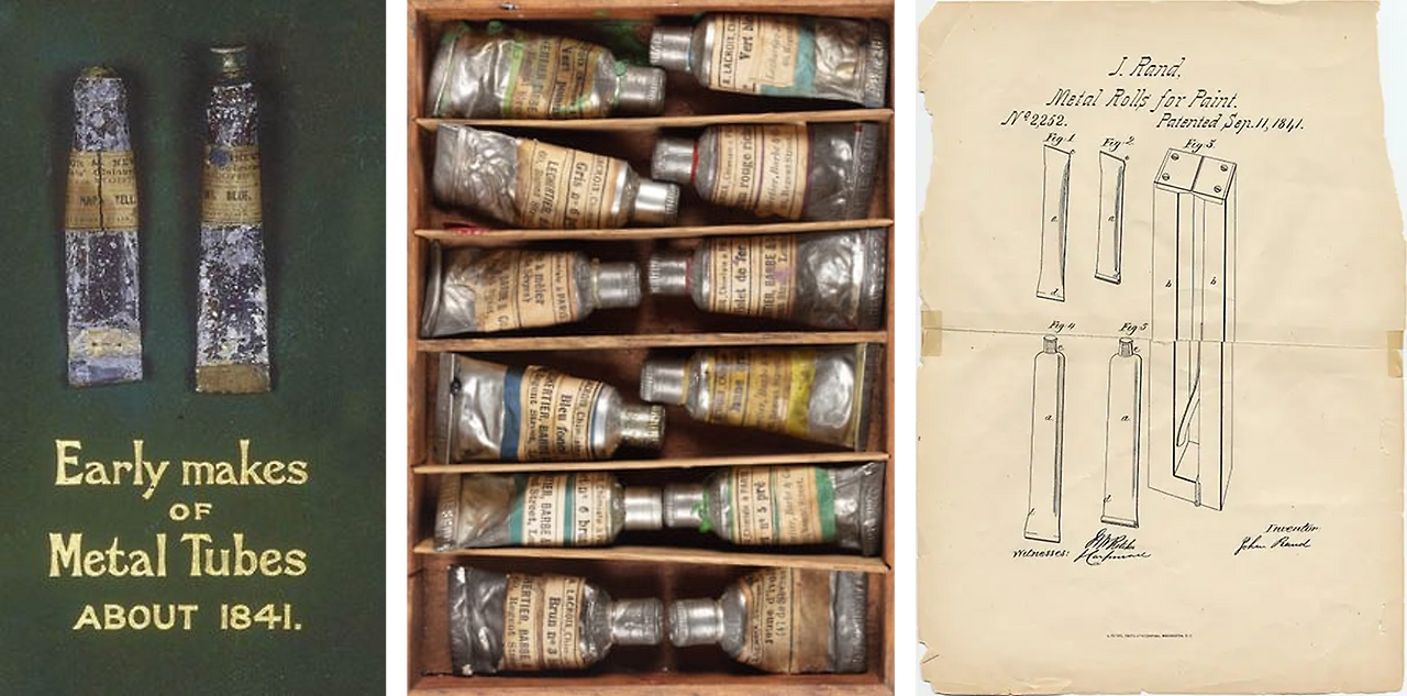 이러한 방식에 결정적인 반전을 가져온 인물이 있습니다. 1841년, 미국의 초상화가이자 발명가였던 존 고프 랜드(John Goffe Rand)는 납으로 만든 나사형 뚜껑의 튜브 용기에 물감을 담는 방식을 고안합니다. 그는 그동안 매번 직접 물감을 만들거나 빠르게 굳는 수제 물감을 보존하는 데 지쳐 있었습니다.