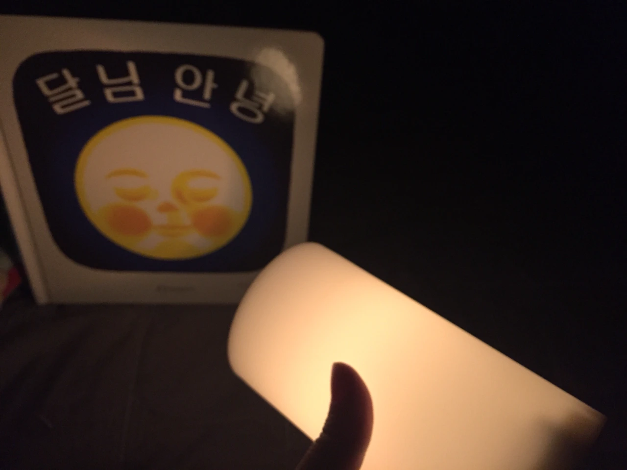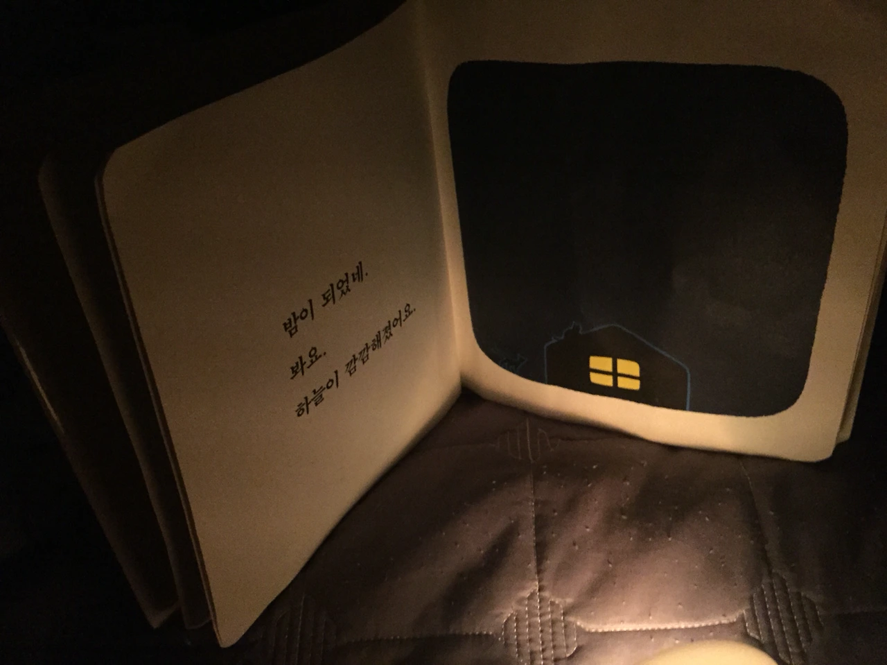 이 책은 다른 책이 있는 곳에 두지 않고 잠자리에 두고 밤에만 읽어주는 것, 불을 끄고 조명만 킨 것, 그리고 그 조명으로 책을 비춰서 아기 관심을 끈 것. 이 세가지 이유로 수면 교육이 잘 된 것 같아요.