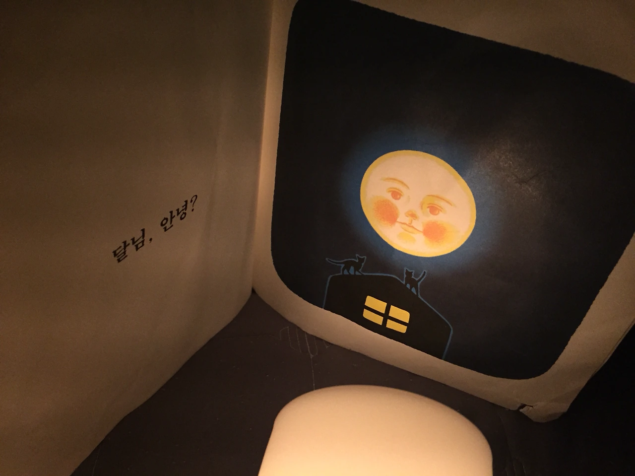 이 대목에서 아기가 가끔 이불에 자기 얼굴을 묻는 걸 보면, 까꿍 놀이라고 생각하는 것 같습니다. 달님이 잠시 안보이지만 없어진 것은 아니라는 걸 아나봐요.