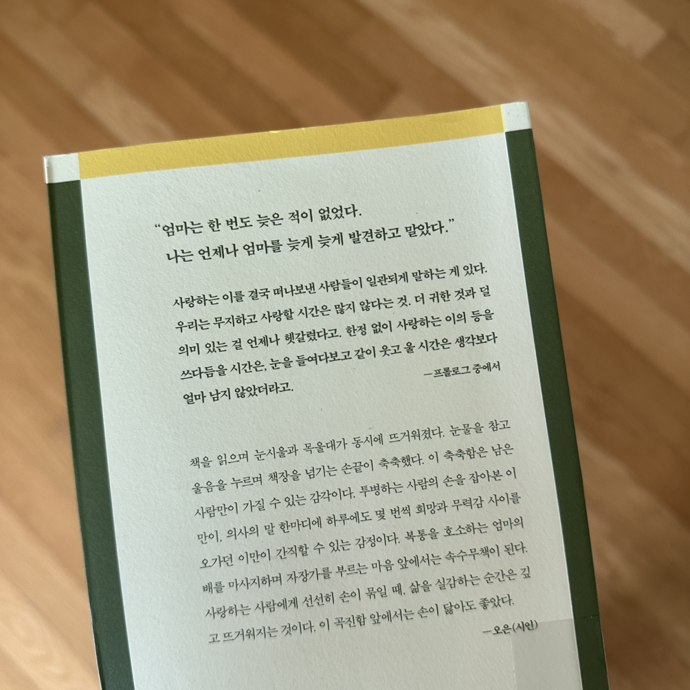 이 책은 엄마 아빠가 암에 걸리시고 투병하시는 이야기, 엄마와 가족에 대한 내용의 에세이 책이다. 너무 슬픈 내용이지만 한편으론 부러웠다. 엄마와의 기록을 이렇게 책으로 남기고, 많은 사람들에게 위로가 될 수 있다는 것이.