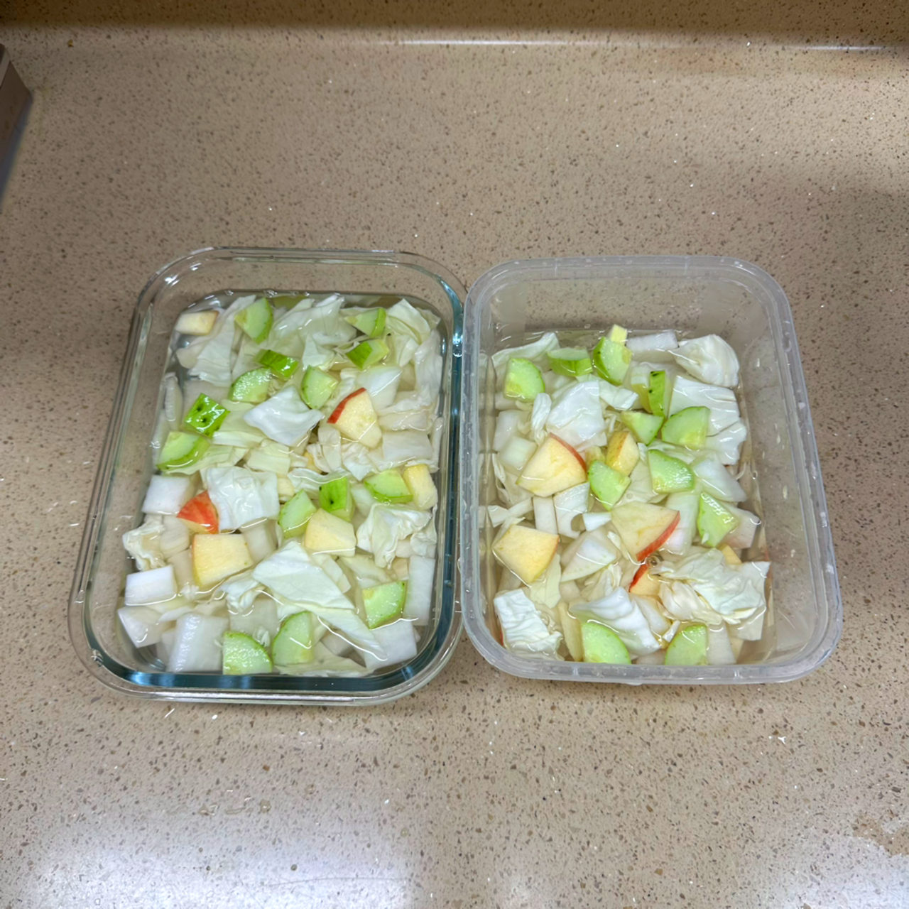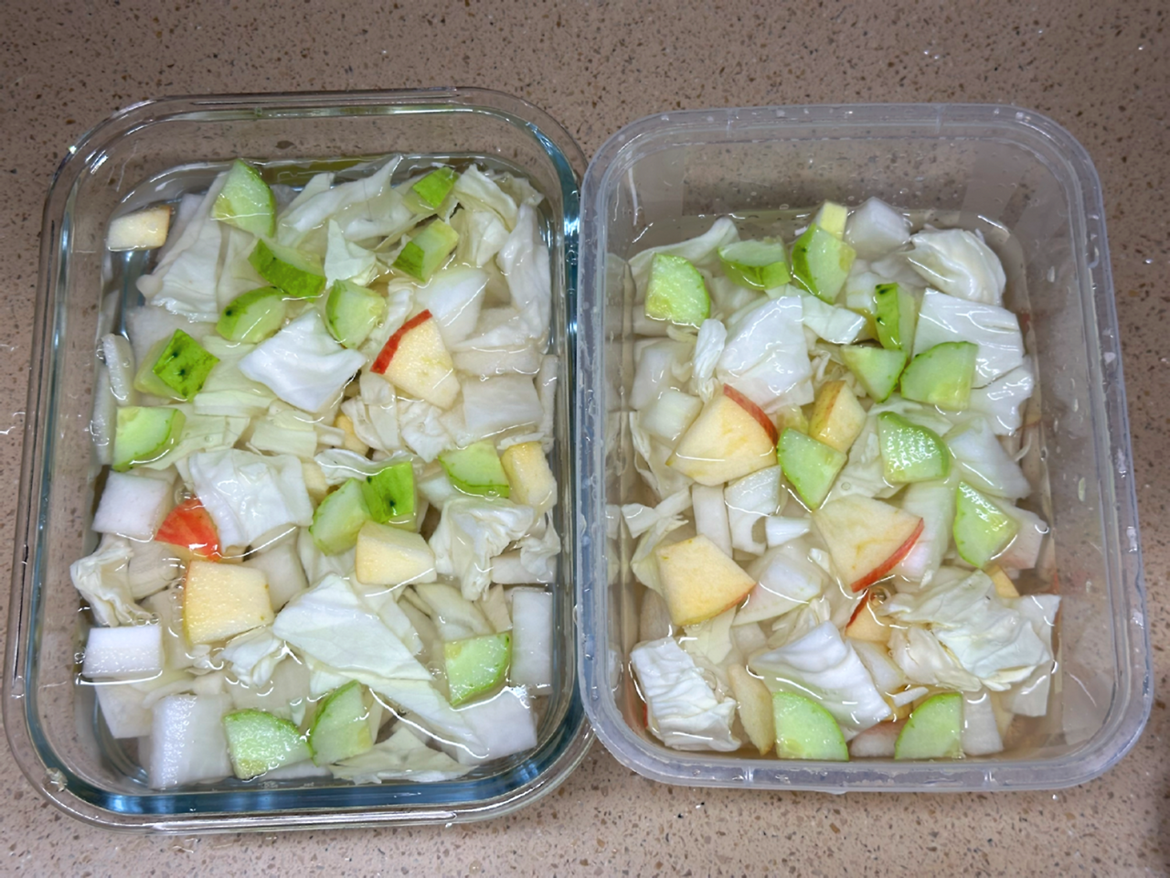 재료는 있는 야채를 넣고 소금물만 넣으면 된다. 배추가 없어서 양배추를 넣었다.