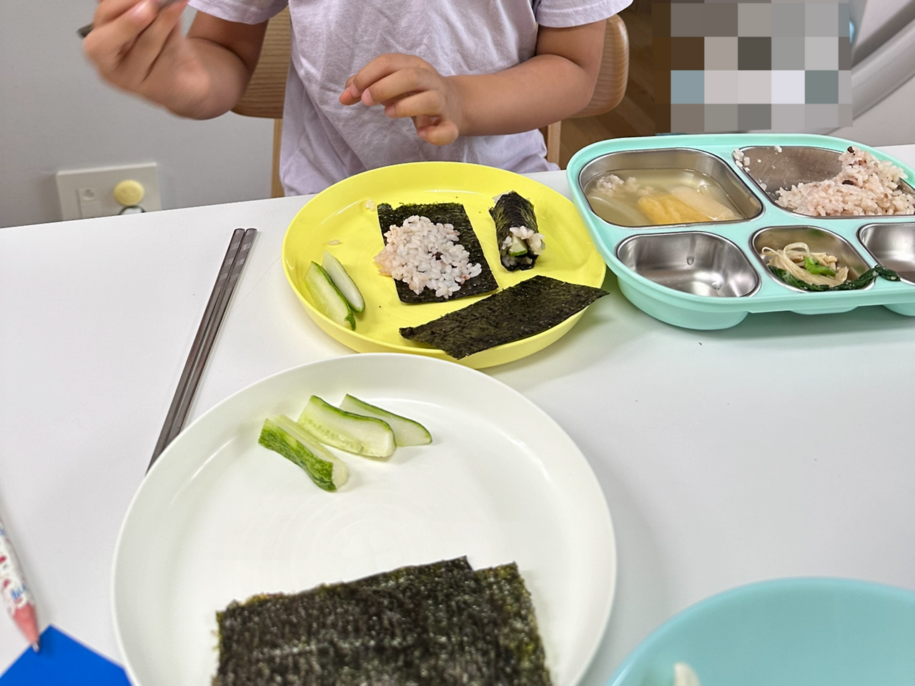 둘째 어린이집 등원시키고 다시 집에 가는 길에 온통 김밥 생각이었다. 사실 요즘은 아침도 안 먹고 오전시간은 공복을 유지하려 한다. 그런데 집에서 만든 김밥은 참을 수가 없었다. 꼬다리를 한 개만 먹어볼까 했는데 결국 두줄을 거의 다 먹었다. 정말 꿀맛이었다. 내가 만들면 이렇게 안되던데 나래도 요리를 잘한다.