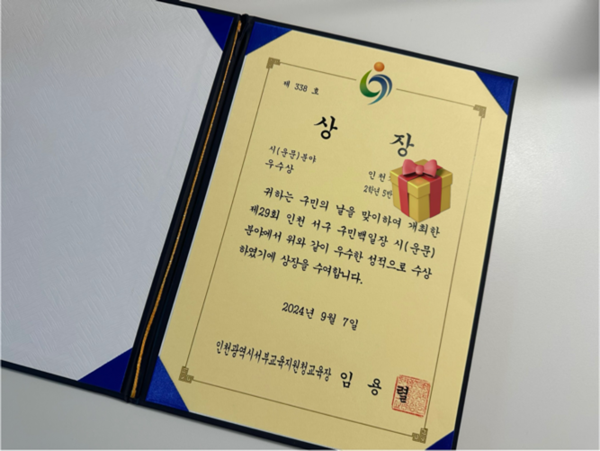 백일장이 무엇인지 경험하게 해 주려고 참가한 것인데 우수상을 받았다. 우리 셋 중에 혼자 상을 받았다. 구 단위의 작은 백일장이었지만 생각지도 못한 상이라 기쁘고 자랑스러웠다. 아이는 정말 기뻐하면서도 부끄럽다고 상장은 학교로 보내지 말라고 했는데 나는 학교로 보내달라고 했다. 소극적이고 내성적인 아이에게 자신감을 키워주고 싶었고 자랑도 하고 싶었다. 청출어람이라는 말처럼 아이가 나보다 글씨도 글도 잘 쓰는 사람이 되었으면 한다. 다음엔 진짜 글쓰기 비법을 좀 알려달라고 해야겠다.