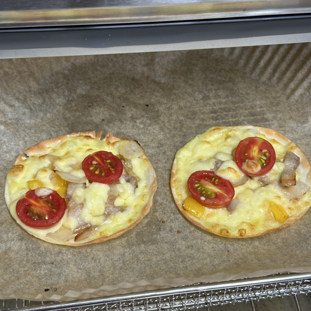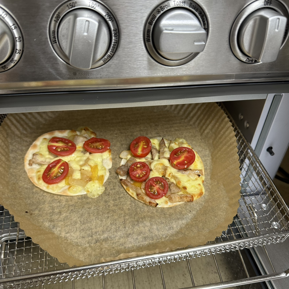이제 만두피 위에 구운 삼겹살과 파프리카, 그리고 치즈를 듬뿍 올리고 방울토마토를 올린다. 이 작업을 아이들과 같이 했는데 직접 요리는 하니 좋아하고 뿌듯해했다. 이제 완성된 예비 만두피피자를 에어프라이어 오븐에 넣고 구워준다. 시간은 잘 몰라 유리문으로 살펴보고 꺼냈다. 너무 오래 하니 만두피 끝 부분이 딱딱해지기도 했다.