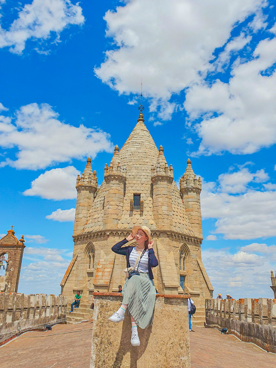 두 사람이 지나갈 수 없는 좁은 돌계단을 오르고 올라 옥상에 도착했다. 평평하지 않고 살짝 기울어진 옥상의 바닥은 마치 내가 지붕 위를 밟고 있는 듯한 기분을 들게 했다. 옥상 자체의 모습도 특별했고, 옥상에서 한눈에 내려다보이는 에보라 시내 뷰도 특별했다. 사람으로 붐비지도 않고 그동안 보지도 못한 새로움도 있는 이 대성당이 너무 마음에 들었다.