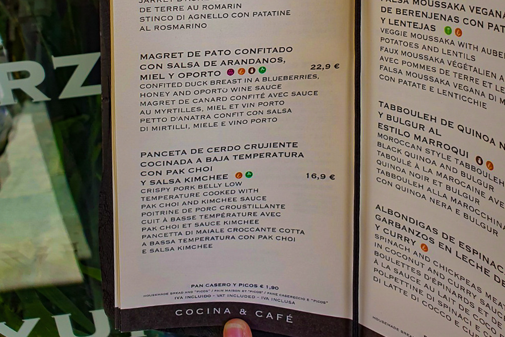고기 메뉴를 한참 보는데, 영어 같지 않은 단어가 보였다. 읽어보니 KIMCHEE. 김치다. 그냥 들어온 스페인 식당에서 김치라니 반가웠다. 어떤 음식일까 읽어보는데 알 수 없는 단어 하나, PAK CHOI.