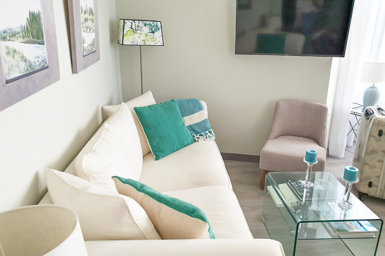 깔끔한 걸 넘어서 모던 심플한 느낌에 싱그러운 청록색 포인트와 회색 톤들로 이루어진 인테리어가 일단 예뻤다. 나중에 돌아와 집 인테리어를 바꿀 때 저 분위기가 좋아, 참고해서 빛이 많이 들어오는 반투명 커튼으로 했을 만큼. 이 공간 자체가 마음에 들었다.