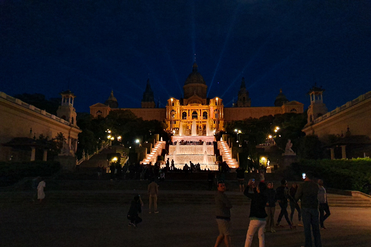 분수쇼가 끝나고 인파가 몰려 빠져나가기 힘들 것에 대비해 일찍 나서려고 돌아섰는데, 환한 달빛 아래 아름답게 불이 들어온 카탈루냐 미술관이 눈에 들어왔다. 미술관 뒤편으로는 화려한 레이저가 나오고 있었고, 앞의 메인 분수쇼에 이어 어우러지는 분수쇼가 함께 작게나마 진행되고 있었다.