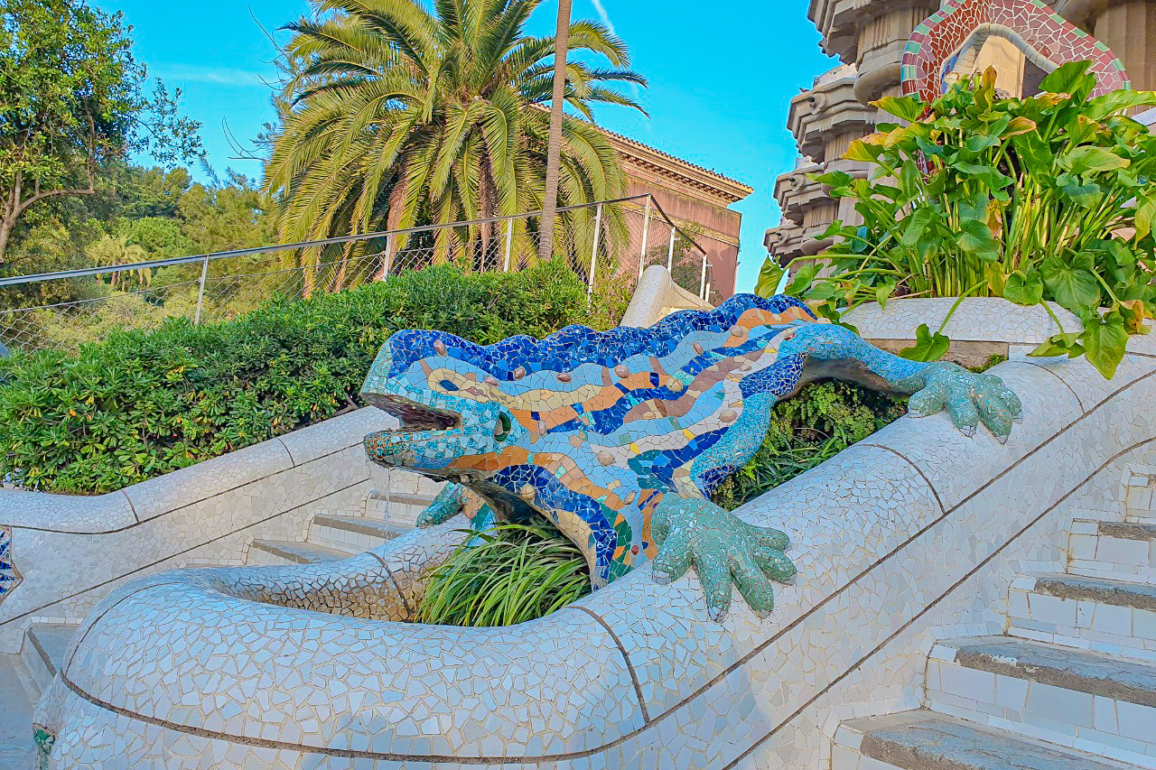 계단 가운데에 있는 카멜레온 조각을 보니 가우디의 작품 속에 온 것이 실감 났다. 아직 오픈 전이라 그런지 분수대 역할은 하고 있지 않았다.