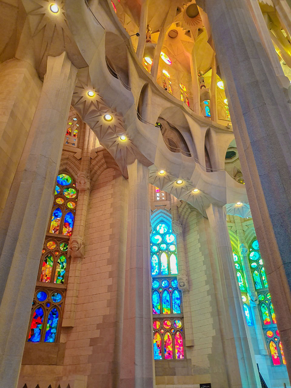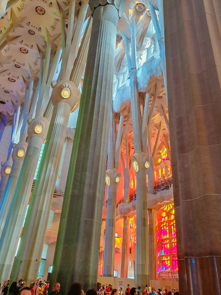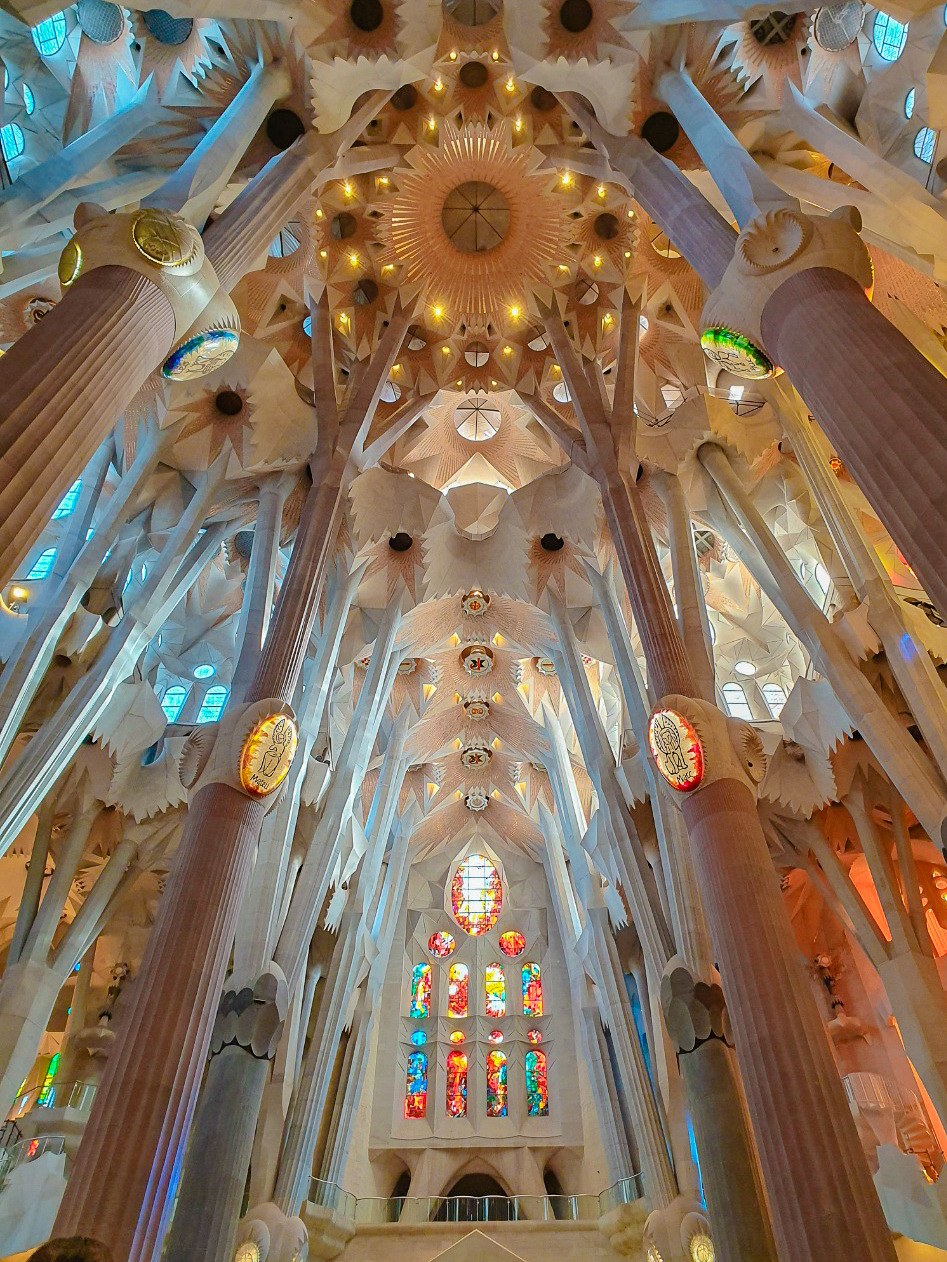 공항 뺨치는 철저한 짐 검사를 거치고 힘들게 들어온 사그라다 파밀리아. 성당 내부에 들어선 순간 느낀 그 황홀함은 잊을 수 없다. 웅장함에서 오는 압도적인 느낌으로만 설명할 수 없는 그 기분. 엄청난 층고에 화려한 스테인드글라스와 백색의 구조물로 비치는 다채로운 빛깔은 자연에서 모티브를 얻으며 접목시켜 온 가우디의 내공을 드러낸 부분이 아닐까 싶다. 층고가 높아지면서 창을 크게 낼 수 있게 되고, 그로 인해 발전한 스테인드글라스의 효과를 가장 잘 이용한 것 같았다.