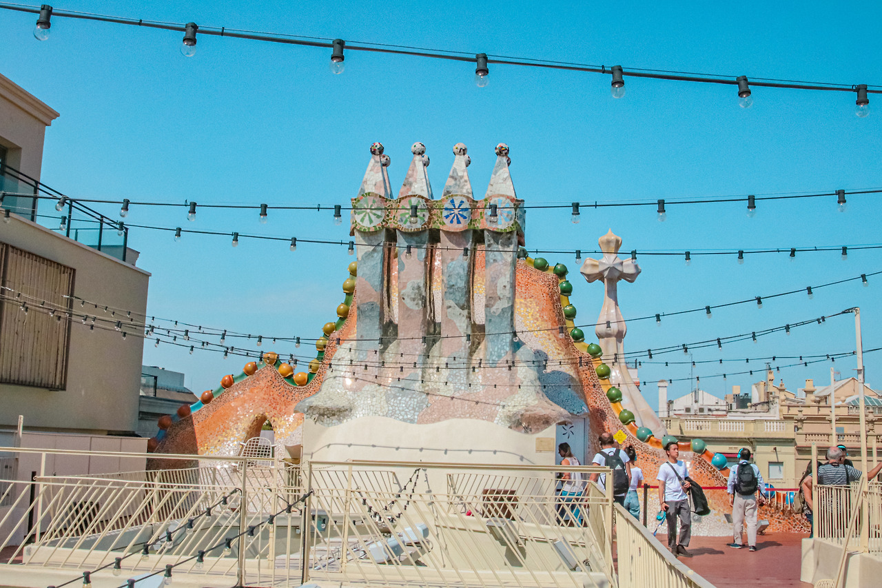 옥상은 앞선 건물들처럼 또 화려했다. 밤을 밝히는 조명 때문에 지저분했다는 말이 첫인상에 더 맞는 말이겠다. 이 옥상에는 아이스크림처럼 생겼던 굴뚝 대신 카사 바뜨요 외관에서 얻었던 용의 비늘 같은 인상의 연장선으로 용을 상징하는 듯한 형상을 띄었다.