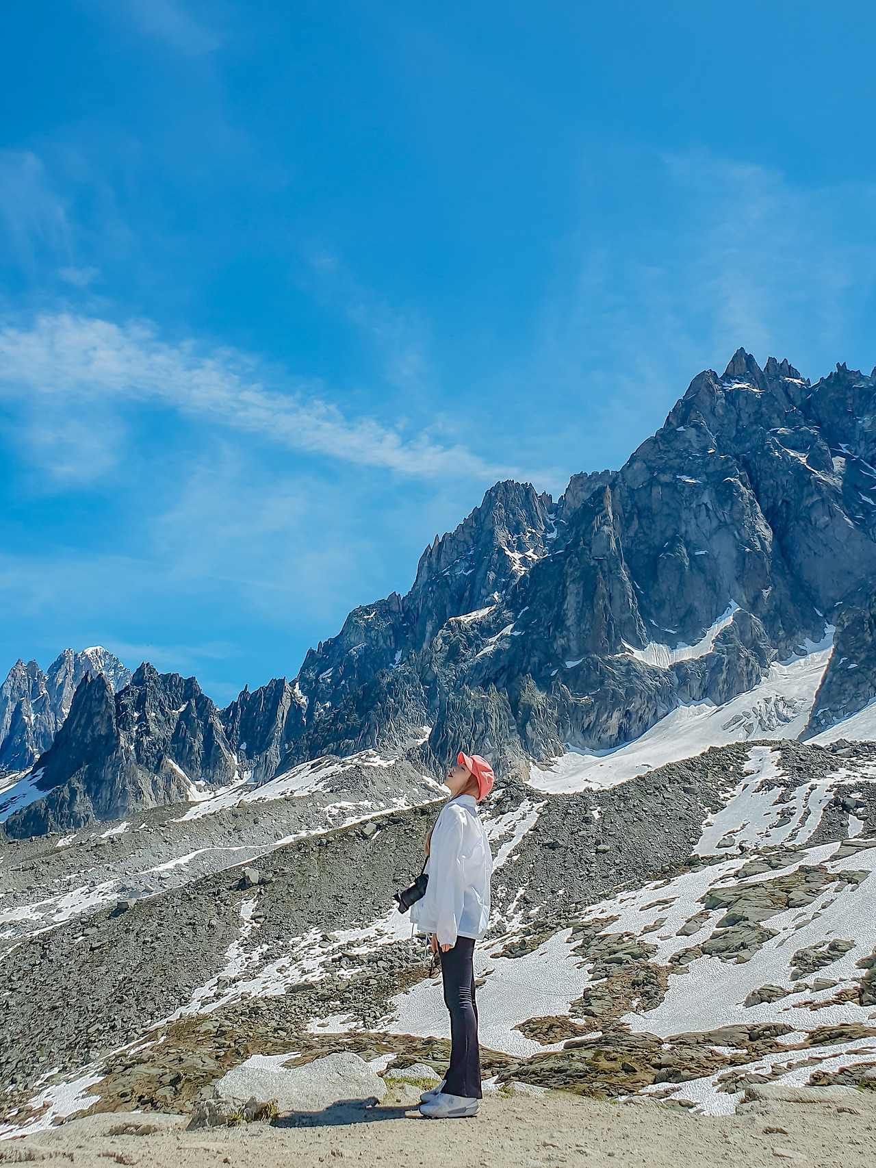 산 중턱에서 봉우리들을 볼 수 있는 포인트로 이어지는 케이블카 정류장에서 내렸다. 개인적으로는 이곳에서 가장 큰 울림을 받았는지, 샤모니를 떠올리면 이곳이 생각난다. 설산이 눈앞에 있어 모든 것을 가로막는 듯한 그 모습이. 푸른 바위, 그 위의 눈. 선 하나하나가 선명해 눈앞을 가로막고 있는 듯했다. 이렇게 나를 압도하는 산이 따뜻한 날씨인데도 불구하고 눈에게 덮여있다는 게 비현실적이어서였을까, 자연을 눈앞에 두고 감정이 울컥 올라왔다. 입가에는 미소를 띠고 있지만 차오르는 감정에 입술이 떨렸고, 코끝이 찡했다. 이런 복합적인 감정이 처음이었다. 점점 고산병 후유증이 나타나는지 기력이 약해지고 있는 엄마와 이 기분을 나눌 수 없다는 게 아쉬울 뿐이었다.