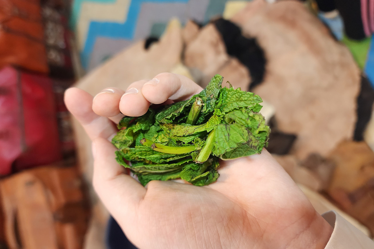 여담으로 이곳의 민트는 우리가 아는 화한 맛이 강하지 않다. 연한 화한 맛이 나고, 설탕을 넣어 단 맛이 더 강느껴지는 정도. 이 차를 마실 때 민트 잎을 그대로 물 속에 집어넣다보니 잎의 향이 그대로 올라온다. 그래서 마실 때마다 스멀스멀 올라오는 그때의 추억에 긍정적이었던 이 민트 티에 대한 첫인상과 달리, 페즈 이후론 부정적으로 변했다. 신기하게도 한순간에 인식이 바뀌지 않고, 시간이 갈수록 싫어졌다. 이 여행을 다녀온 지 수개월이 지난 지금도 여전히 좋아하지 않는다.