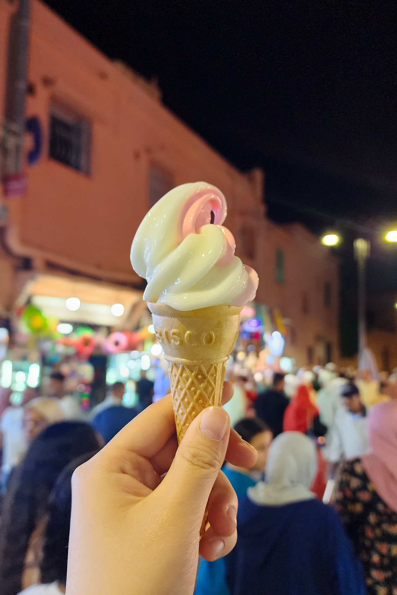 4월 말에도 37도에 육박할 정도로 덥고 건조한 마라케시. 갈증 난 우린 길을 나서자마자 보이는 아이스크림으로 저녁을 시작했다. 한화로 약 200원. 저렴한 만큼 맛도 그렇다. 애매하고 끈적이는 게 어딘가 불량한 느낌.