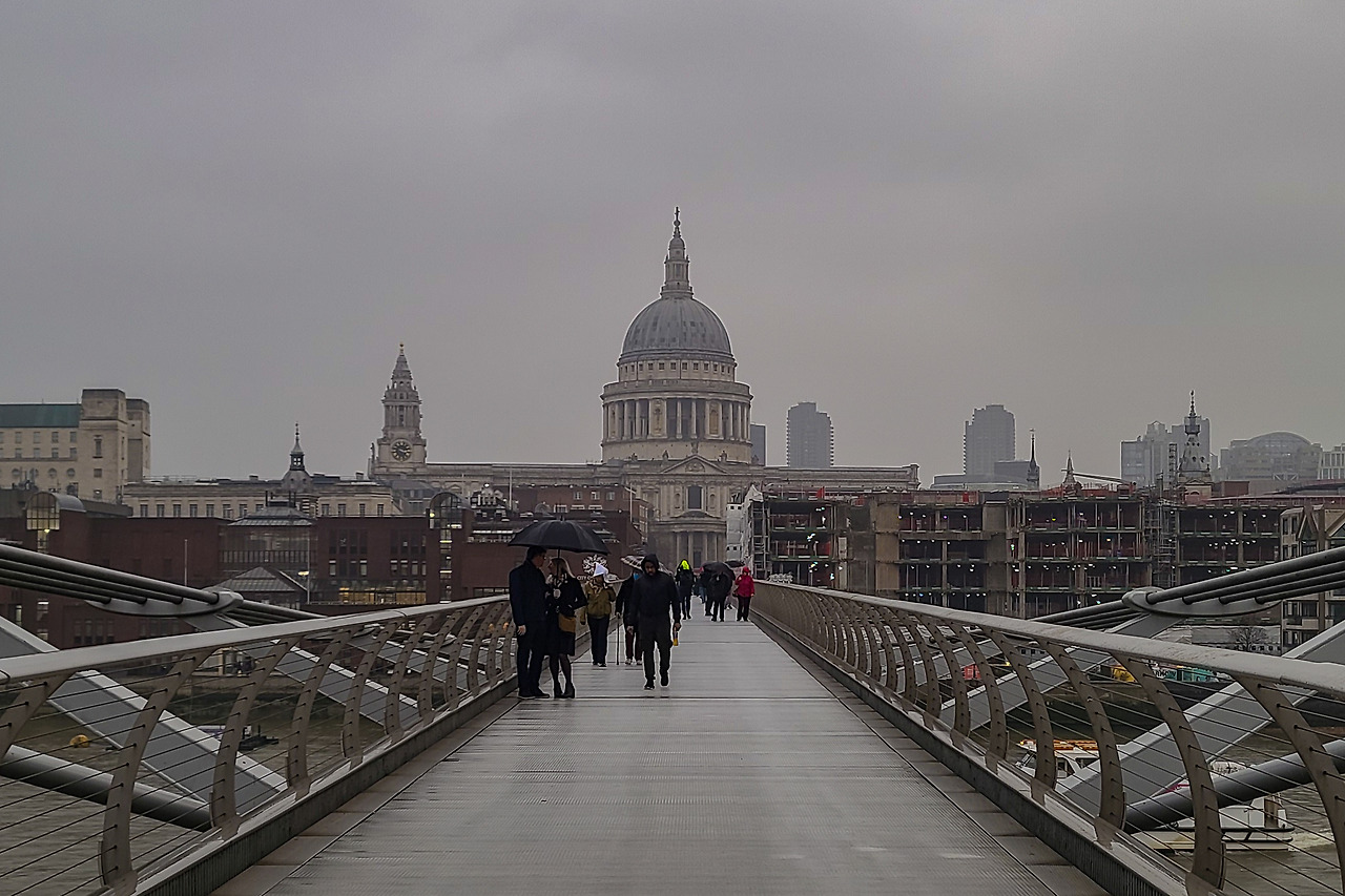 앞을 똑바로 보면서 걸을 수 없을 만큼 비가 꽤 왔고, 안개 때문에 가까울 줄 알았던 대성당이 보이지 않자 막막했다. 돌아온 길을 봤지만, 다시 가고 싶지도 않았다. 테이트 모던은 이미 봤고, 오늘의 남은 목적지는 대성당뿐이었으니까. 밀레니엄교에서 바라보는 대성당이 포인트인지라 더 포기할 수 없었다. 다시 오기에 위치도 애매하고.
