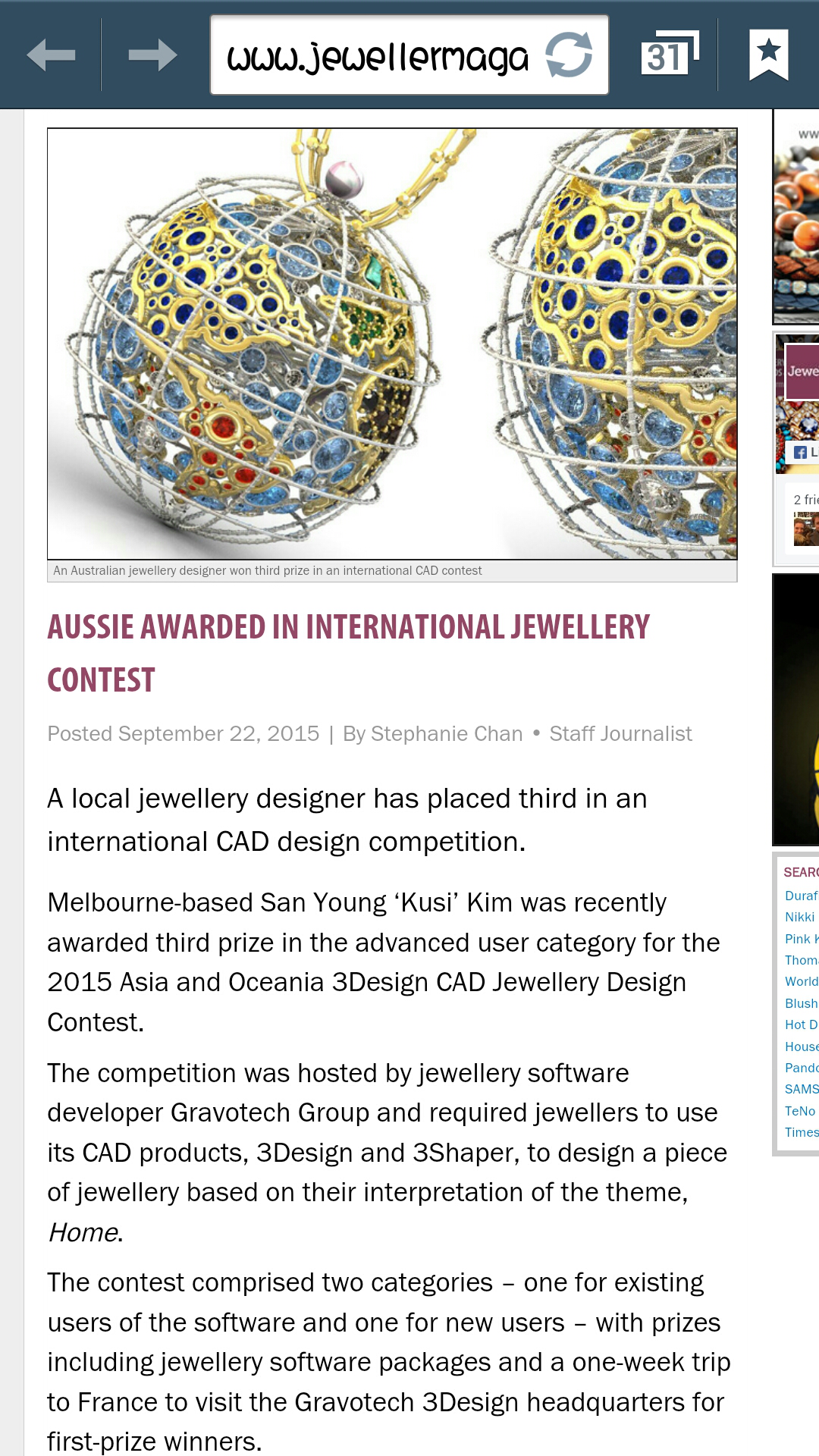 자, 다음 질문으로 넘어갈게. 쿠시 너는 회사 일 이외에서도 주얼리 디자이너로서 대회에서도 좋은 성적 내면서 활동하고 있다고 들었어. 요리나 바리스타 대회 이야기는 많이 들었지만 그쪽 업계의 대회 이야기는 생소해. 어떤 작품으로 어떤 대회에서 수상했는지 이야기해줄 수 있어?