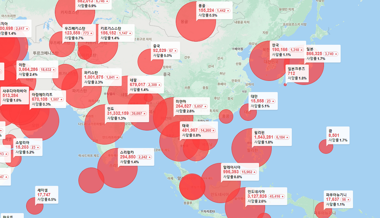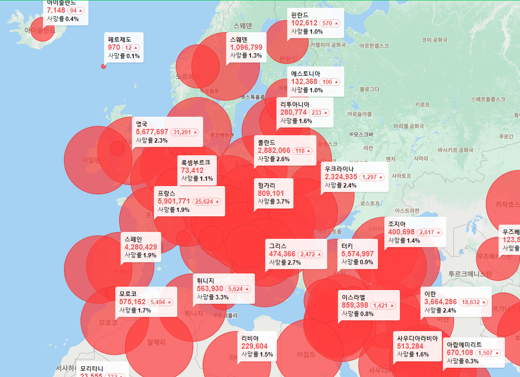 인터넷 검색창에 "전세계 확진자"라고 검색하면 쉽게 볼 수 있는 각 국의 확진자/사망률 현황