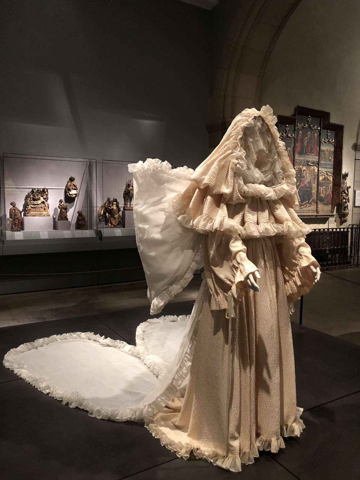 전시장 쪽으로 가니, 입구에는 높이 세워져 있는 마네킨들에 멋진 의상들이 입혀져 있었다. 헤븐리 바디즈는 종교적 색채가 담긴 의상 전시라고 보면 된다. 옛날 가톨릭 주교의 의상부터 여러 디자이너 브랜드에서 만든 종교적 의미를 담고 있는 의상들이 주제라고 볼 수 있다.