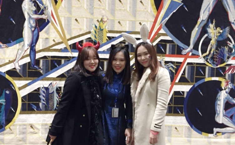 파티 당일 우리 인턴들은 금요일 근무를 마친 후 저녁을 간단히 먹고 UN 근처의 숙소에 가서 옷을 입고 화장을 하기 시작했다. 각자 일할 때 입었던 정장을 할로윈 코스튬으로 갈아입고, 서로 화장하는 것도 도와주고 준비과정을 사진으로 담다 보니 파티에 갈 시간!