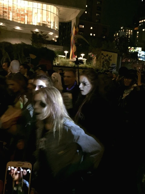 퍼레이드를 함께 하러 거리로 나온 사람들은 정말 대강 분장한 것이 아니라 좀비영화나 공포영화에 당장 출연시켜도 될 만큼 정교하게 분장도 하고, 의상도 신경을 정말 많이 쓴 사람들이 대다수였다. 나는 정말 코스튬만 입었지, 분장 수준의 화장을 하지 못했기 때문에 부끄러울 정도였다. 자세가 안 되어 있어! 반성이 절로 나왔다. 사람들과 사진을 찍으면 찍을수록 나의 얼굴은 쌩얼 수준임을 깨달았다. 게다가 추워서 코스튬 위에 가죽자켓을 입는 만행까지. 코스튬을 욕되게 한 것 같았다. 하지만 나의 건강은 소중하니까(아니 저질체력 때문) 어쩔 수 없었다. 평생 한번 해보는 할로윈 퍼레이드였는데 아직도 후회되는 추억의 한 조각이다.