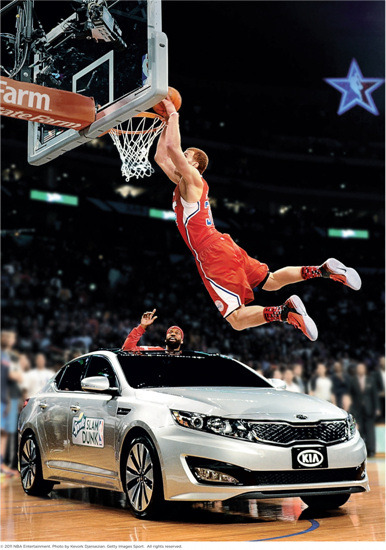 옵티마를 뛰어 넘어 덩크 슛을 성공하는 블레이크 그리핀