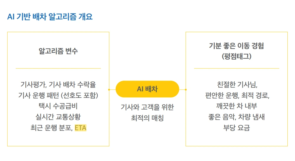 ④ 카카오택시 / 이용자가 택시 서비스를 선택하여 호출하게 되면 인공지능에 기반한 배차 알고리즘이 작동합니다. 배차 알고리즘은 이용자와 택시의 최적 매칭을 위해서 다양하고 방대한 데이터를 실시간으로 분석합니다. 이후 이용자를 중심으로 빠른 시간 안에 도착할 수 있는 반경 내의 택시가 배차 후보가 되는 것입니다. 단순히 거리뿐만 아니라 실시간 교통량 등 다양한 데이터를 분석해 가장 빠르게 도착할 수 있는 택시가 있을 경우 해당 차량이 배차됩니다. 이용자들의 입장에서 가까운 택시는 단순히 거리만 가까운 것이 아닌 이용자의 시간을 얼마나 절약해줄 수 있느냐도 함께 고려되어야 하기 때문입니다. 더불어 이용자가 남긴 기사에 대한 평가, 기사의 배차 수락률, 기사 운행 패턴 등 정량적 데이터 또한 분석 대사에 포함됩니다. 이를 통해 이용자는 단순히 빠르게 이동하는 것이 아니라 보다 기분 좋은 이동이 가능합니다. 고도의 배차 시스템을 통해 기존에는 배회영업 중심의 시장이었던 택시 시장이 플랫폼 기반으로 성장할 수 있게 되었습니다. 수백만 개의 호출을 사람이 일일이 배차했다면 불가능한 일입니다.