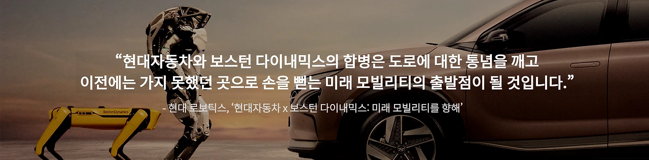 현대자동차는 보스턴 다이내믹스를 인수하면서 미래 모빌리티 기업으로의 첫걸음을 내디뎠습니다. 어쩌면 가까운 미래에 새로운 모빌리티의 모습을 길가에서 마주할 수 있을지도 모르겠네요. 현대자동차와 보스턴 다이내믹스가 그리는 미래의 모습, 기대되지 않으세요?