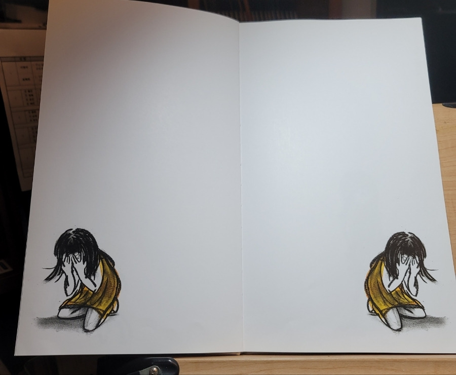 그리고 첫 장면처럼 바닥에 앉아 고개를 숙인 채 웅크리고 있다. 하지만 첫 장면과 마지막 장면은 소녀의 위치가 달라져 있다. 처음에는 오른쪽, 마지막 장면에서는 왼쪽에 앉아 있다. 두 소녀를 각각 다른 위치로 구분해서 표시했다.