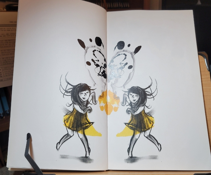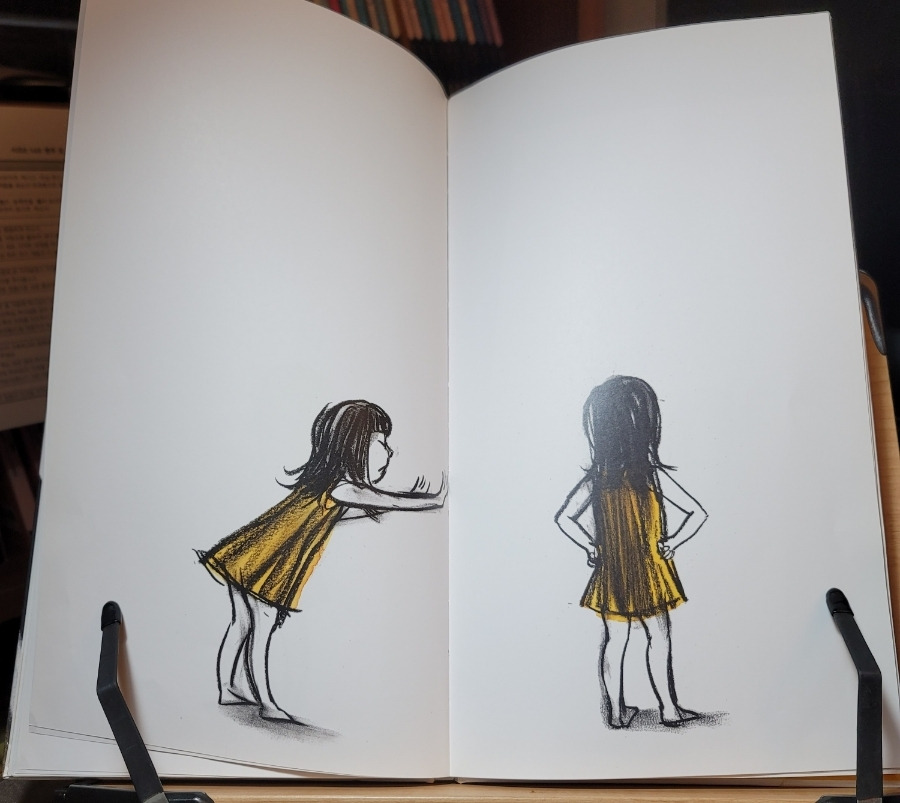 그리고 마침내 그 소녀를 거부하고 밀어내려 한다. 이때도 책의 가운데 접지를 작가는 아주 영리하게 활용한다. 힘껏 밀어내자 유리 거울이 비스듬히 넘어가면서 와장창 바닥으로 떨어져 깨져버린다. 깨진 거울이 상징하는 것은 무엇일까? 이 부분 또한 독자의 해석이 필요한 부분이다. 다시 혼자가 된 소녀... 고개를 숙이고 있다.