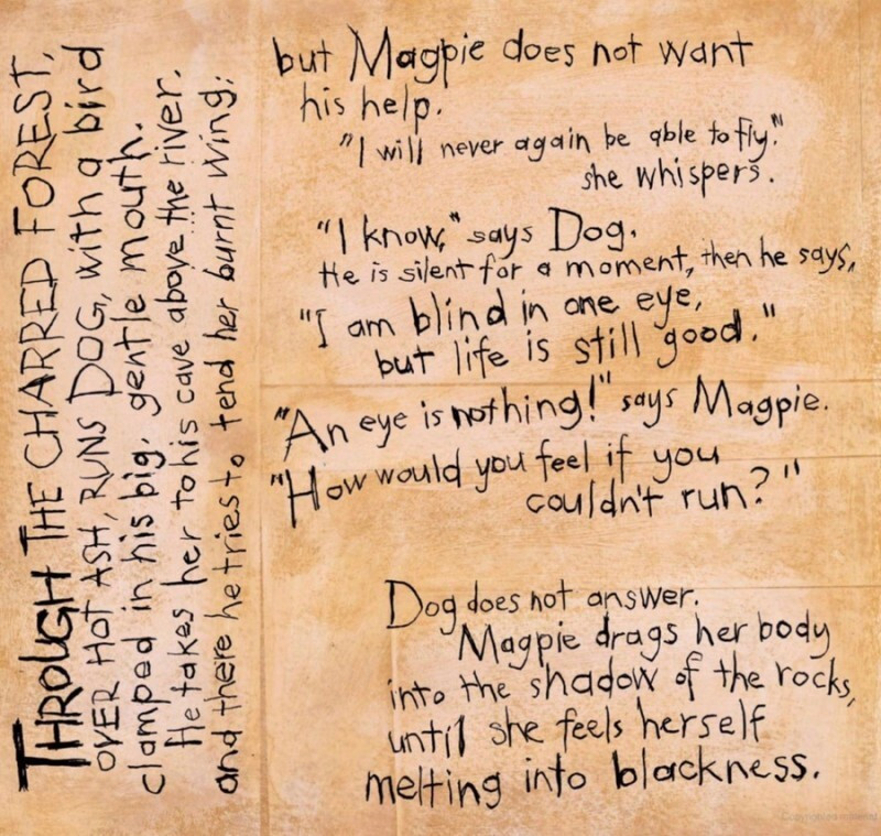 하지만 까치는 "난 다시는 날지 못할 거야"라고 말하며 개의 도움을 거절하고 바위 그늘 속에 몸을 웅크린다.