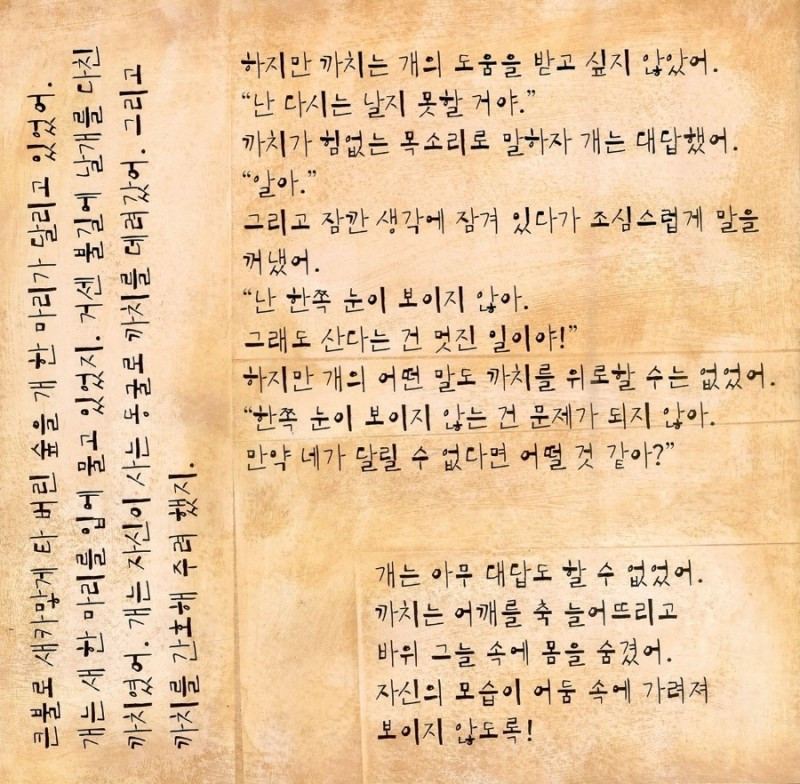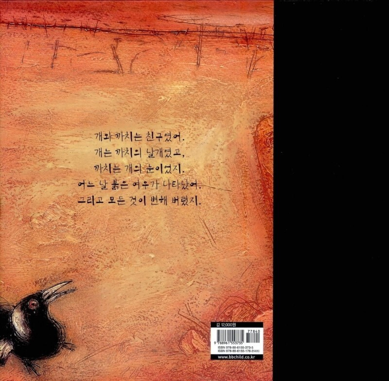 미취학 아동과 초등 저학년 어린이들을 대상으로 이 책을 읽어주면 어떻게 받아들일지 궁금하다. 까치가 한쪽 날개 없이 불안한 걸음으로 사막을 가로질러 개가 있는 곳을 향해 먼 여행을 떠나는 마지막 장면 뒤에 이어질 뒷이야기를 상상해 보는 것도 재미있을 것 같다.