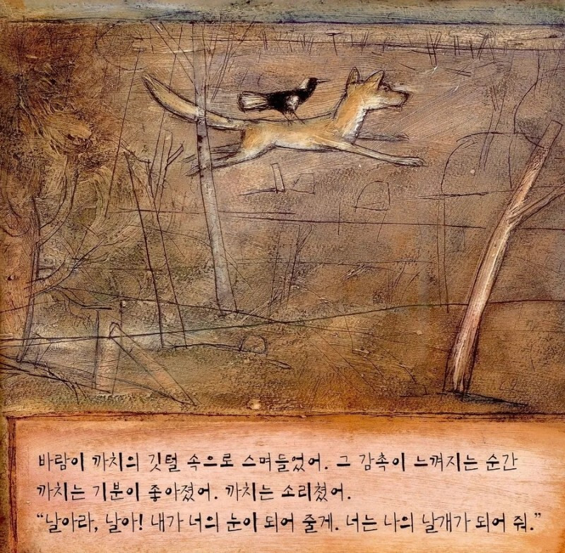 여우는 까치를 등에 태우고 먼지 날리는 평야와 소금밭을 질주해 붉은 사막까지 달려간다. 잠깐 동안 까치는 진짜 하늘을 나는 기분을 만끽한다. 하지만 여우는 사막 한가운데서 등에 앉은 까치를 벼룩을 털어내듯이 떨어뜨리고 혼자 떠난다. 여우는 한참 걷다가 뒤돌아보면서 "이제 너와 개는 외로움이 뭔지 알게 될 거야"라는 말을 까치에게 한다. 까치는 붉은 사막 한가운데서 몸을 웅크리고 있다가 얼마 후 혼자 남겨 두고 온 개를 생각해 내고는, 비틀거리는 걸음으로 '친구가 있는 곳을 향해 멀고 먼 여행'을 시작한다. 이렇게 그림책은 열린 결말로 끝난다.
